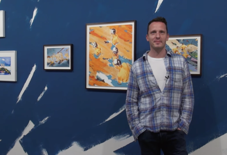 As of mid-June, the Galerie Templon’s latest exhibition of works by the artist, will travel to Le Confort moderne, a former industrial building turned into a trending place for the cultural life of Poitiers. In this new series, Bisky has chosen to swap the pastel blue of his skies for darker hues and the luminous smiles of his models for more serious expressions. His baroque scenes feature bronzed models who bring to mind the communist propaganda which marked the artist’s youth in GDR. Alongside them are the night birds, hipsters and outsiders who populate the streets of Berlin Friedrichshain every evening, drifting among the post-industrial facades that characterise the district, a favourite haunt of the city’s denizens of the night.