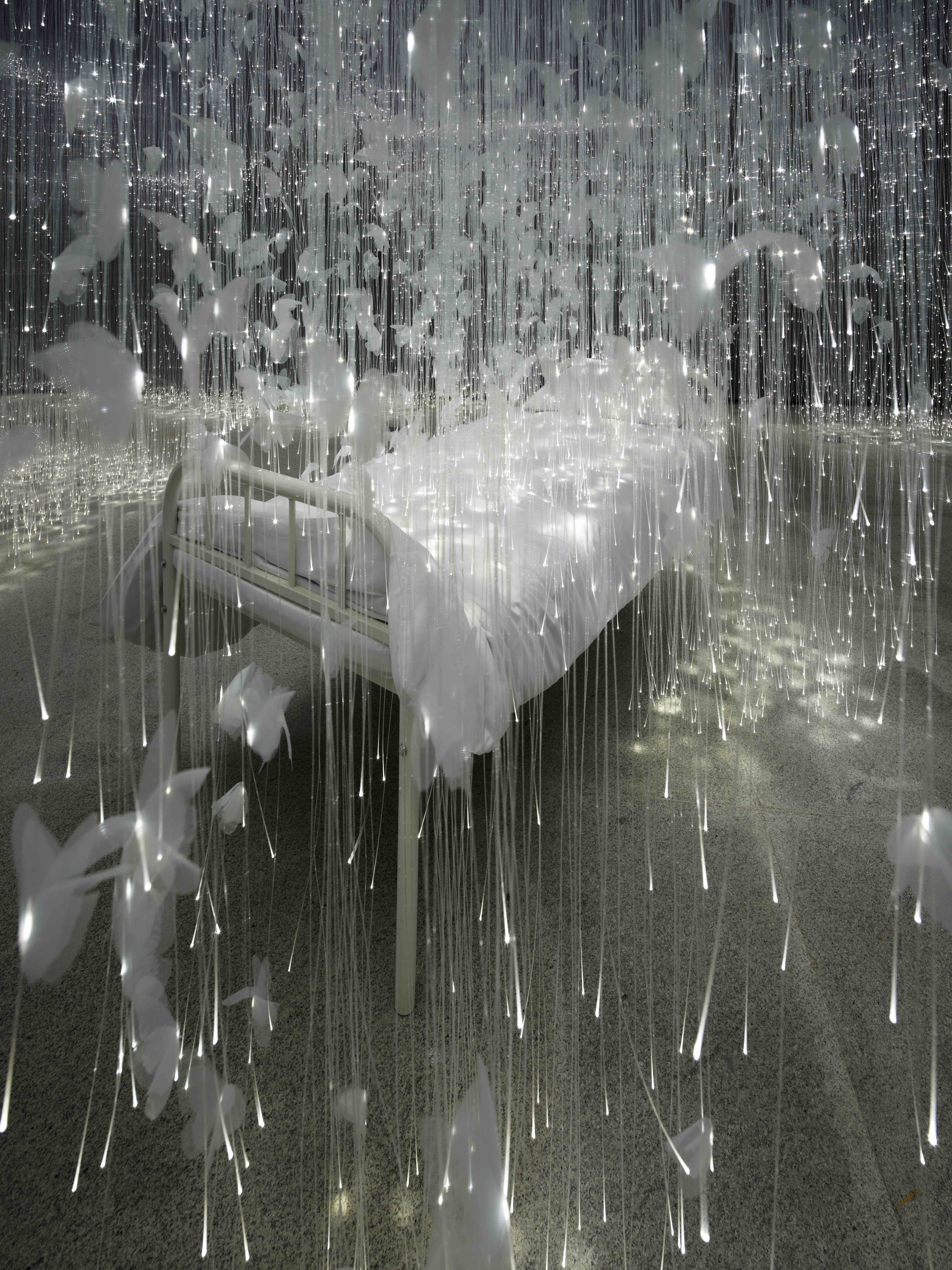 After studying painting in Kyoto, Chiharu Shiota turned away from the medium to explore performance art. Her search for new forms of expression brought her to Germany, where she eventually began using the materials and techniques that would express her artistic voice the best. Thereby, turning to installations, creating vast, ephemeral environments. Through a subtle weaving of knotted threads, she constructs striking scenographies that integrate objects imbued with memory: window frames, discarded musical instruments, suitcases, keys, books, and second-hand garments. Her monumental installations -now emblematic of her practice – have been exhibited in museums worldwide, forming a singular body of work that explores notions of existence, memory, and transcendence. With Echoes Between, Chiharu Shiota delves into the realm of death, a liminal space where consciousness drifts and transforms. Around two chairs, thousands of luminous threads form a radiant cloud, like a shower of living particles, evoking a continuous dialogue between the real and the imaginary.