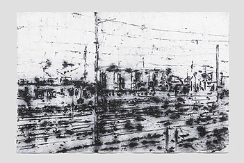 Le premier corpus, composé de 32 dessins au fusain et à l’acrylique sur papier Arches, fait surgir des architectures incertaines, issues d’une collecte visuelle mais détachées de toute référence directe. Réduites à leurs structures essentielles, elles deviennent carcasses, grilles, canevas – variations graphiques où l’âpreté du fusain se heurte à la fluidité de l’acrylique. Les surfaces, griffées et lacérées, engendrent des paysages tragiques, d’une tension dramatique qui s’oppose à tout lyrisme impressionniste.