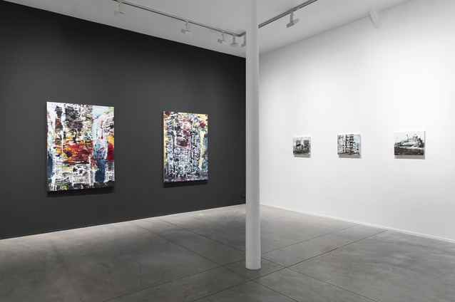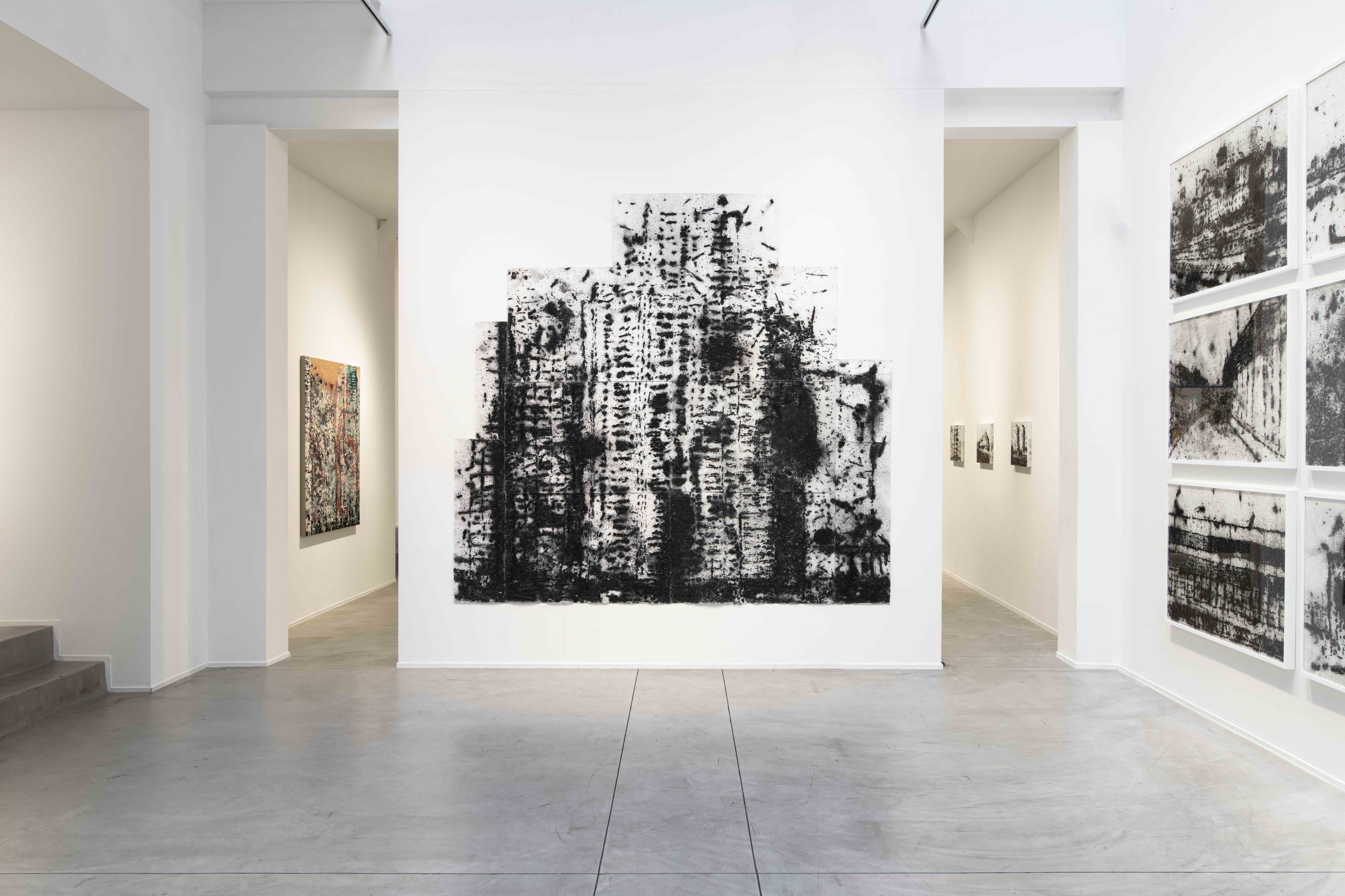 The first body of work, consisting of 32 charcoal and acrylic drawings on Arches paper, brings forth uncertain architectures, drawn from a visual collection but detached from any direct reference. Reduced to their essential structures, they morph into carcasses, grids and canvases—graphic variations where the harshness of charcoal clashes with the fluidity of acrylic. The scratched and lacerated surfaces create tragic landscapes, with a dramatic tension that counters any impressionistic lyricism.