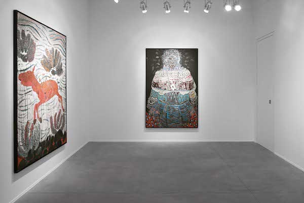 Omar Ba gave up the abstraction of his early years to embrace an ambiguous figuration fully open to interpretation. Painted on large corrugated cardboards, his paintings exhale a sense of fragility contrasting with the force of the subjects. With a seemingly chromatic simplicity, Omar Ba creates an uncanny bestiary, mixing abstract patterns and luxurious nature, with emblems of power or hints of war.