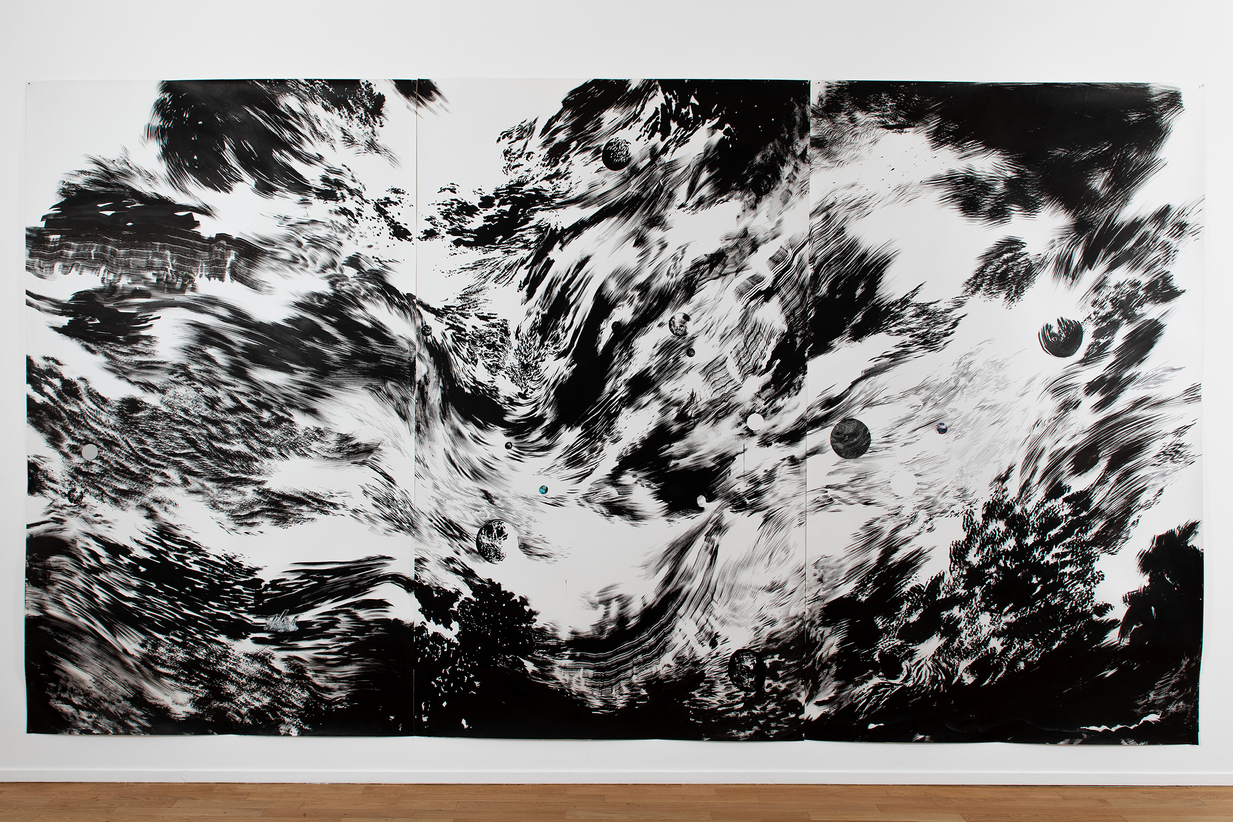 From enveloping moving matter at the New York Drawing Center (2015-2016) to a cave animated by a furious circular vortex for the Sharjah Biennale (2017) and a fossilised Big Bang covering the floor of the Collège des Bernadins (2018), his somewhat metaphysical installations question our relationship with the intangible, the infinite, the invisible. Inspired by literature, astrophysics, philosophy and esotericism, his work redefines classical drawing by incorporating it into installations, sculptures and murals.