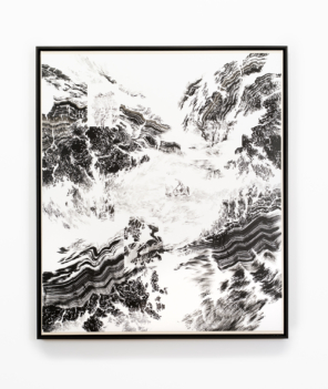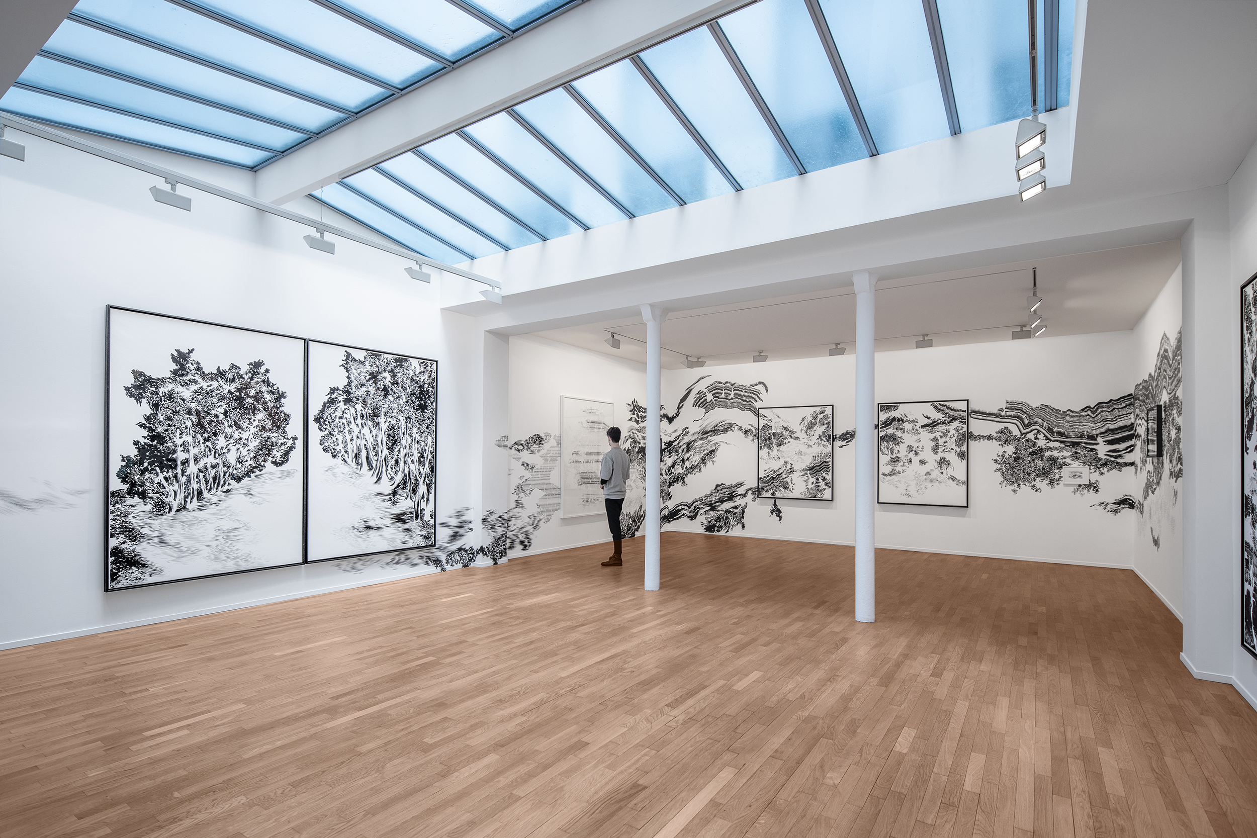 The exhibition at Galerie Templon marks a new chapter in the artist’s career, moving towards further physical density. The Engramme mural spreads throughout the gallery space and interacts with the drawings displayed on its surface. It galvanises the entire space, both with its intangible flows and marks and by anchoring the drawings’ substance in place, bedding in the lines and subjects. The piece creates a sort of moving archaeology which roots the celestial manifestations and gives us an accelerated view of drawn-out geological periods, past events that still have an impact to this day. The drawings on paper are superimposed with the mural, complementing or hiding it, and fleetingly bring form to the informal while multiplying the interpretations and temporalities of the practice of drawing, turn in turn dynamic, playing with empty space, and fossilised.