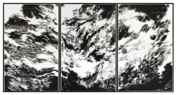 His vast ephemeral frescoes are painted directly onto walls with ink, transforming architecture into an otherworld, a world of flux and mental landscapes, between the recognizable and the indiscernible, on the border between the physical and the symbolic. Reflecting on the workings of perception, his works explore our systems of knowledge, the survival of myths and beliefs, but also reminiscences, retinal or neuronal persistence, whether on museum walls or sheets of paper.