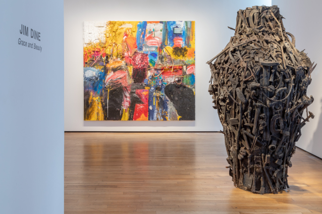 Combining large scale paintings on wood panel and anthropomorphic bronze sculptures, Jim Dine explores the notion of creation, its power and its limits. The outsized paintings evoke the painter’s intimate world of studio walls and palettes, their looming presence bringing to mind stage sets, both abstract and figurative. At their heart lie interlaced brass pipes and various tools, either crushed and distorted beyond recognition. As a counterpoint, a group standing sculptures, part machine, part plant, part classical statues, display a rare degree of complexity and technical virtuosity.