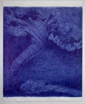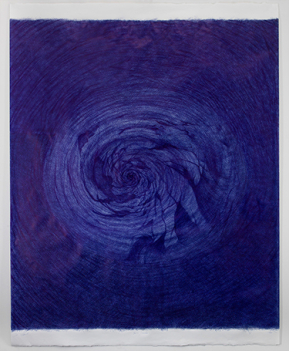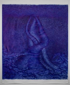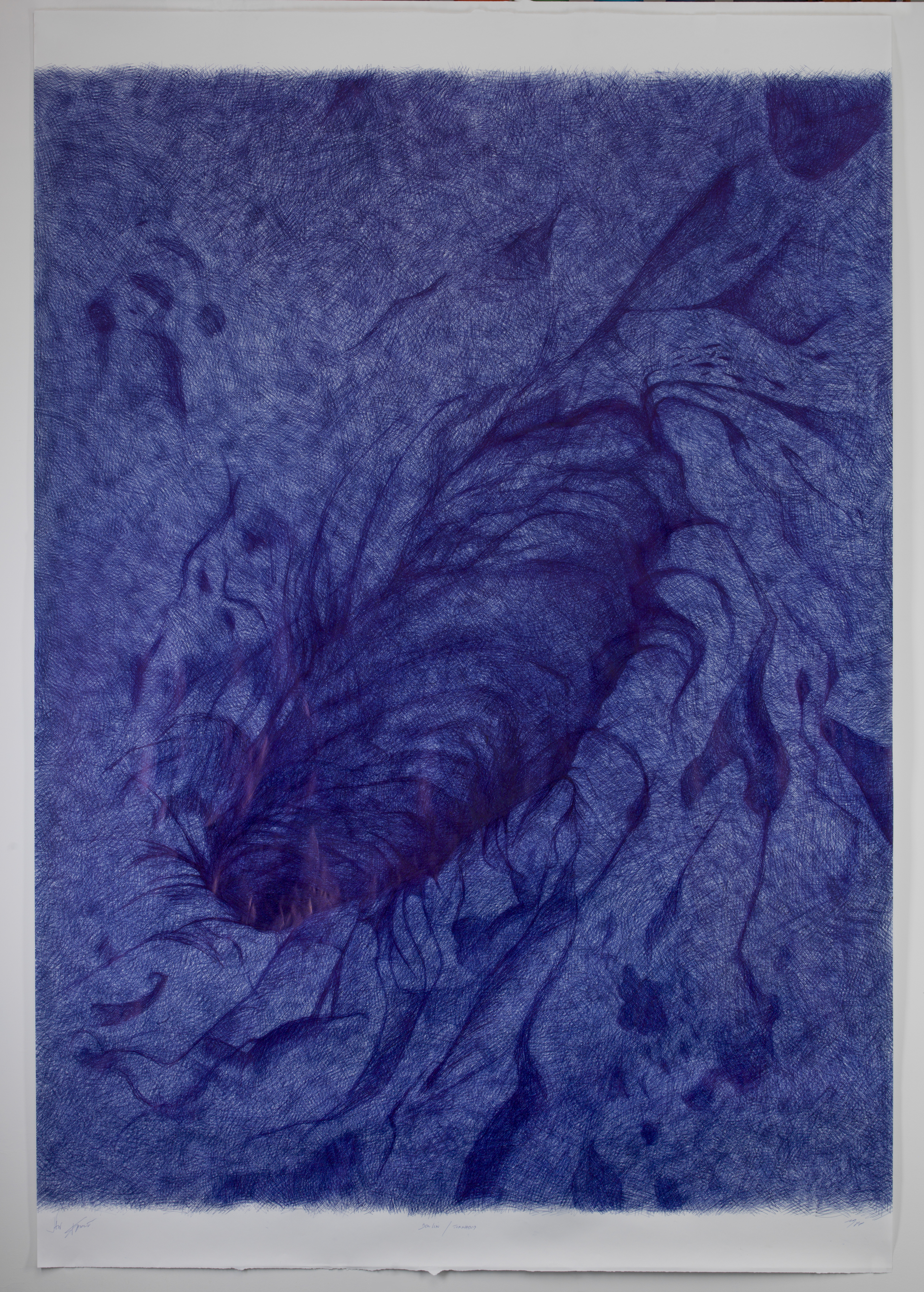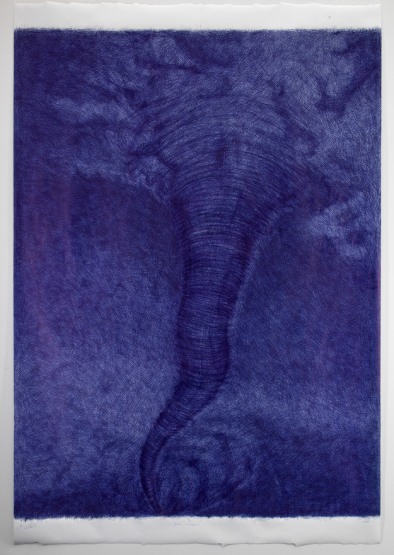 Jan Fabre is considered as one of the most important and innovative figures on the international contemporary art scene. A radical artist whose works have often unleashed passionate responses, Jan Fabre had his own “Blue Period” during the 1980’s, centring on the ballpoint pen, his then favourite material, with which he meticulously covered large expanses of paper to create his metaphorical and tormented drawings. In 1988, at the age of 30, Fabre found himself in Berlin, spending sleepless nights obsessively drawing, colouring and rubbing out an entire cosmogony featuring tornados, cyclones, giant waves and storms. The highly distinctive metallic blue of his disposable pen form mesmerizing landscapes, their details so dense and intense they almost seem to tear the paper. Each drawing thus emerges as the peak of a one-man performance, a powerful act on the verge of hallucination and exhaustion. The young artist, penniless at the time, sold the whole series to a generous patron. The drawings remained rolledup, untouched and forgotten for 30 years. Recently unearthed, they are now on public display for the first time, taking the viewer on a disconcerting journey through the genesis of Jan Fabre’s imagination.