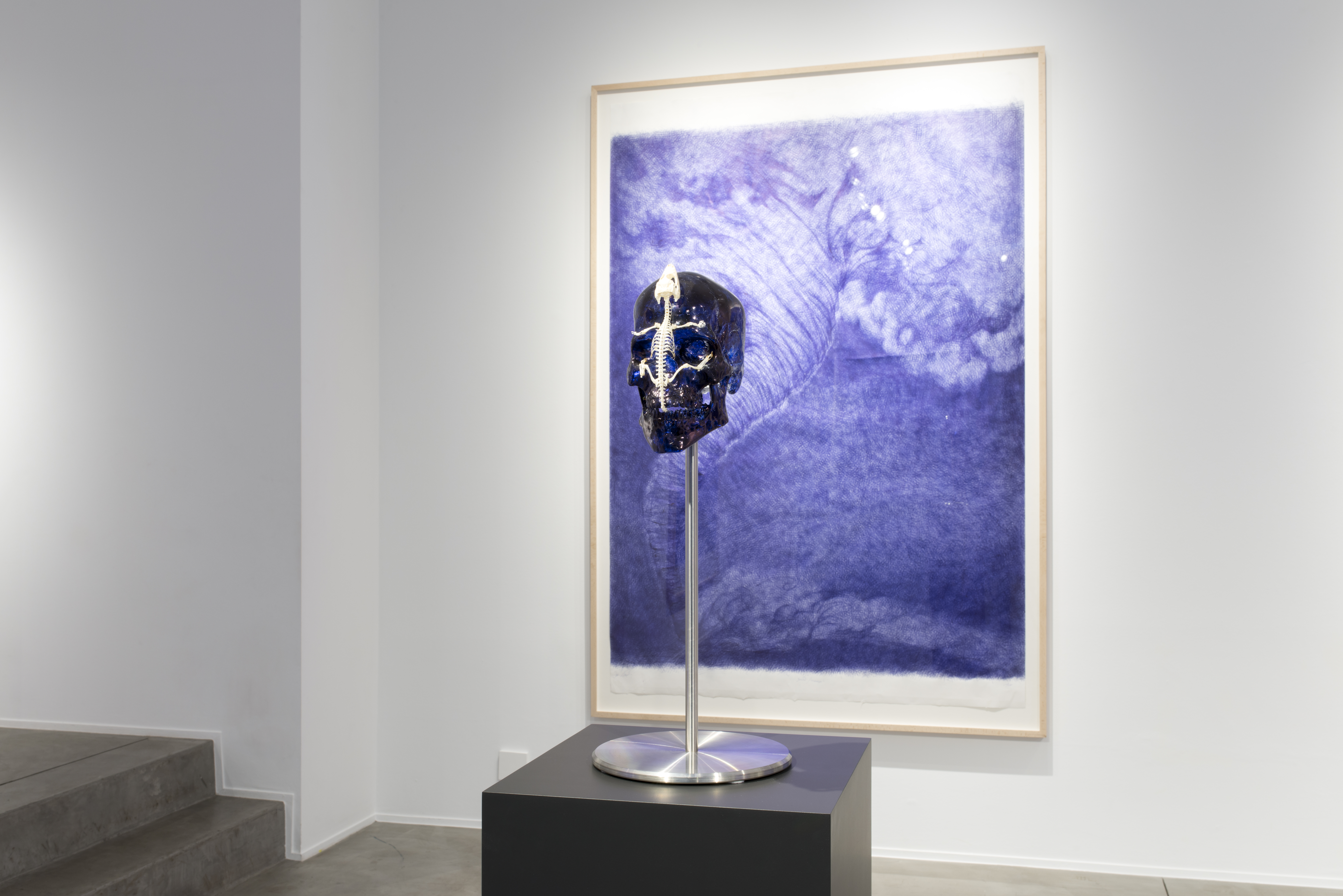 The exhibition title, L’Heure Sauvage, refers to The Hour Blue defined by entomologist Jean- Henri Fabre. It conjures up that brief moment of silence when Nature awaits the dawn with bated breath; a fundamental yet fleeting moment when life is suspended between two worlds, night and day, in an enthralling near darkness echoed in the artist’s metallic works with their subtle suggestion of curves. The blue ink becomes a skin, which both conceals and reveals, either reflecting the light like a mirror or shrouding the viewpoint. With his new sculptures in Murano glass, Fabre covers human skulls with ink-stained handprints. The skulls act as a mirror, giving us an unsettling vision of our own mortality. Like strange fetishes – vanities or self-portraits? – they are trapped under skeletons of animals: birds, rodents, and an entire fauna we imagine surviving the human race yet already decimated.