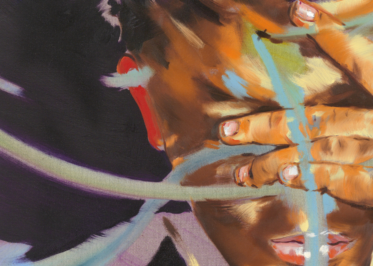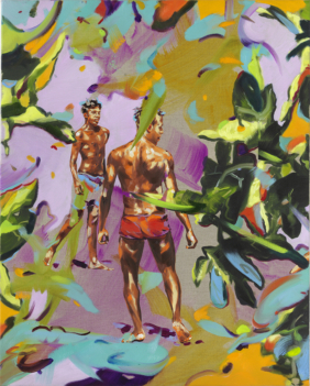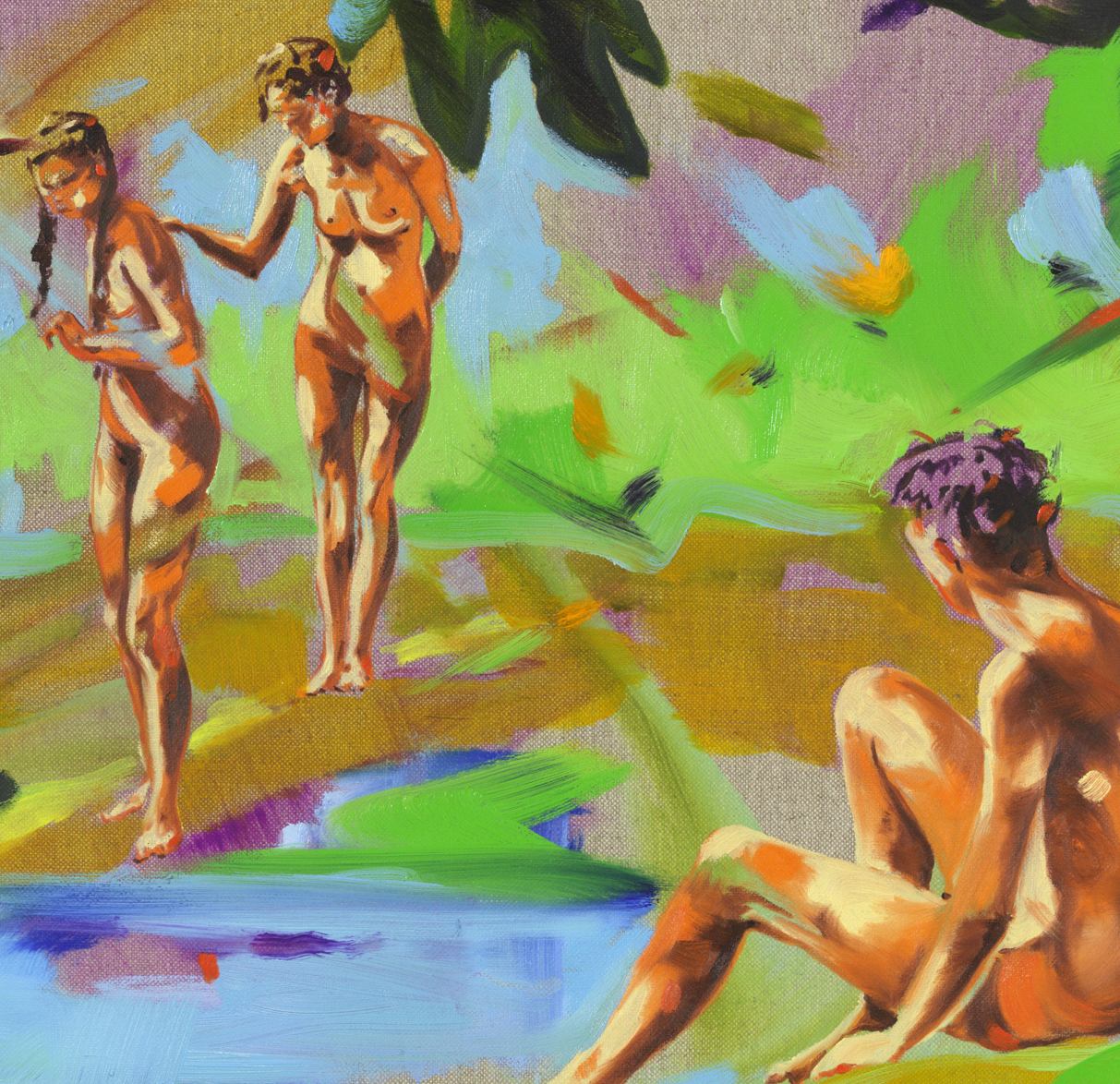 The series of oils on canvas with their shimmering colours, almost unbearably vivid, are rooted in the socialist realism of his childhood as well as the codes of contemporary hedonism. Ludology is based on the work of Dutch historian and cultural theorist Johan Huizinga, who contrasts Homo Faber, rational and focused on progress, with Homo Ludens, a being governed by the characteristics of play. Ludology is Bisky’s interpretation of play philosophy, lifting the curtain on the ambiguity of a society obsessed with perfection and idleness.