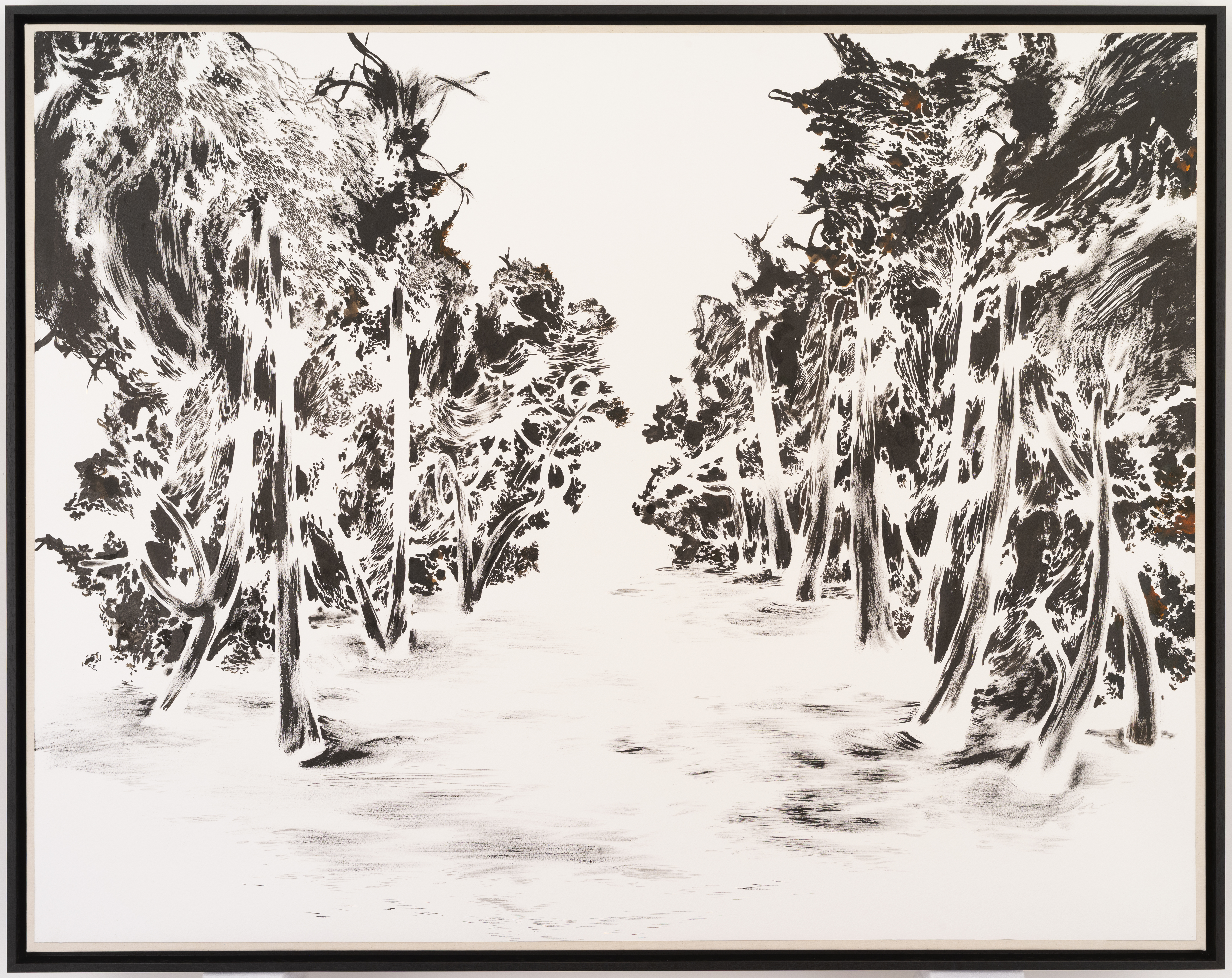 His vast ephemeral frescoes are painted directly onto walls with ink, transforming architecture into an otherworld, a world of flux and mental landscapes, between the recognizable and the indiscernible, on the border between the physical and the symbolic. Reflecting on the workings of perception, his works explore our systems of knowledge, the survival of myths and beliefs, but also reminiscences, retinal or neuronal persistence, whether on museum walls or sheets of paper.