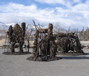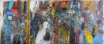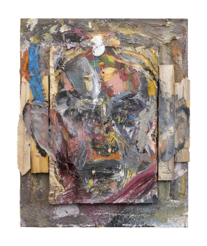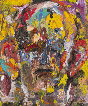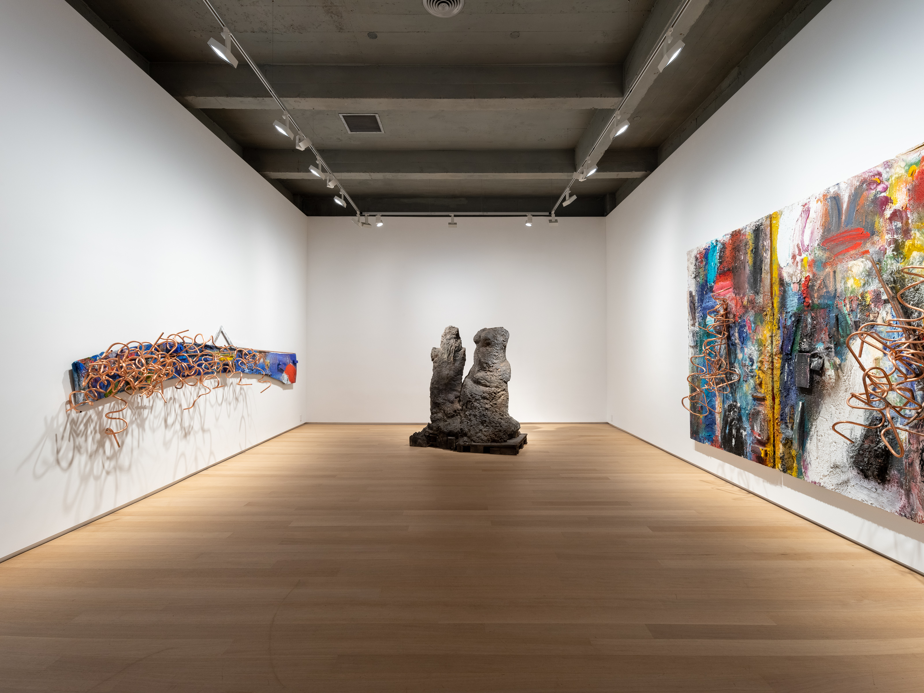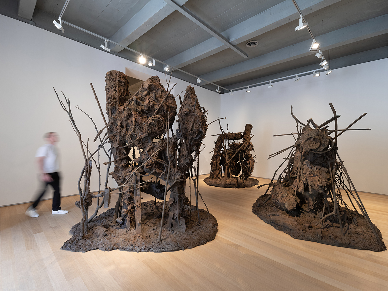 “Three Ships” brings together the production of the past three years: monumental bronze sculptures, rows of intimate self-portraits and five massive abstract paintings on wood.