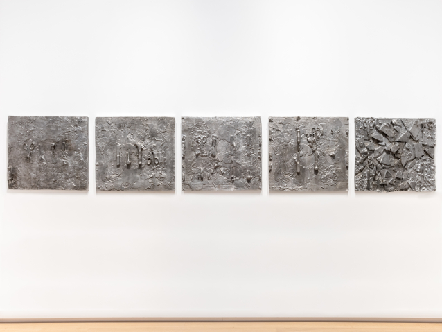The basement of the gallery, for example, creates a dialogue between rare reliefs of tools from 1967, never exhibited before, with a series of pencil drawings made since the pandemic. Both realistic and poignantly intimate, they portray the artist as an old man, lucid yet youthful.