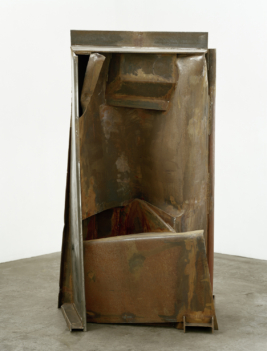 After the spatial restrictions of a commission, Anthony Caro focuses on the sculpture’s dimension as object. He incorporates cast—off objects into the Upright Sculptures — drinking trough, rail sleepers, mooring post — whose original purpose is thus forgotten. In rusted steel, cast iron and wood, compressed inside the vertical structures that give them their name, the sculptures seem to be on the point of imploding. These works reflect Anthony Caro’s quest to create sculptures “with no exterior”, where all the significance lies in the depth.