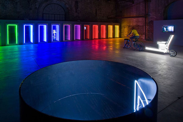 Né en 1972 à Santiago, Iván Navarro a grandi sous la dictature de Pinochet. Il vit et travaille à New York depuis 1997. L’artiste utilise la lumière comme matériau de base, détournant des objets en sculptures électriques et transformant l’espace par des jeux d’optique. Au-delà de son aspect ludique, son œuvre est hantée par les questions de pouvoir, de contrôle et d’emprisonnement. Toujours présent en filigrane, le détournement de l’esthétique minimaliste devient le prétexte d’une subtile critique politique et sociale.