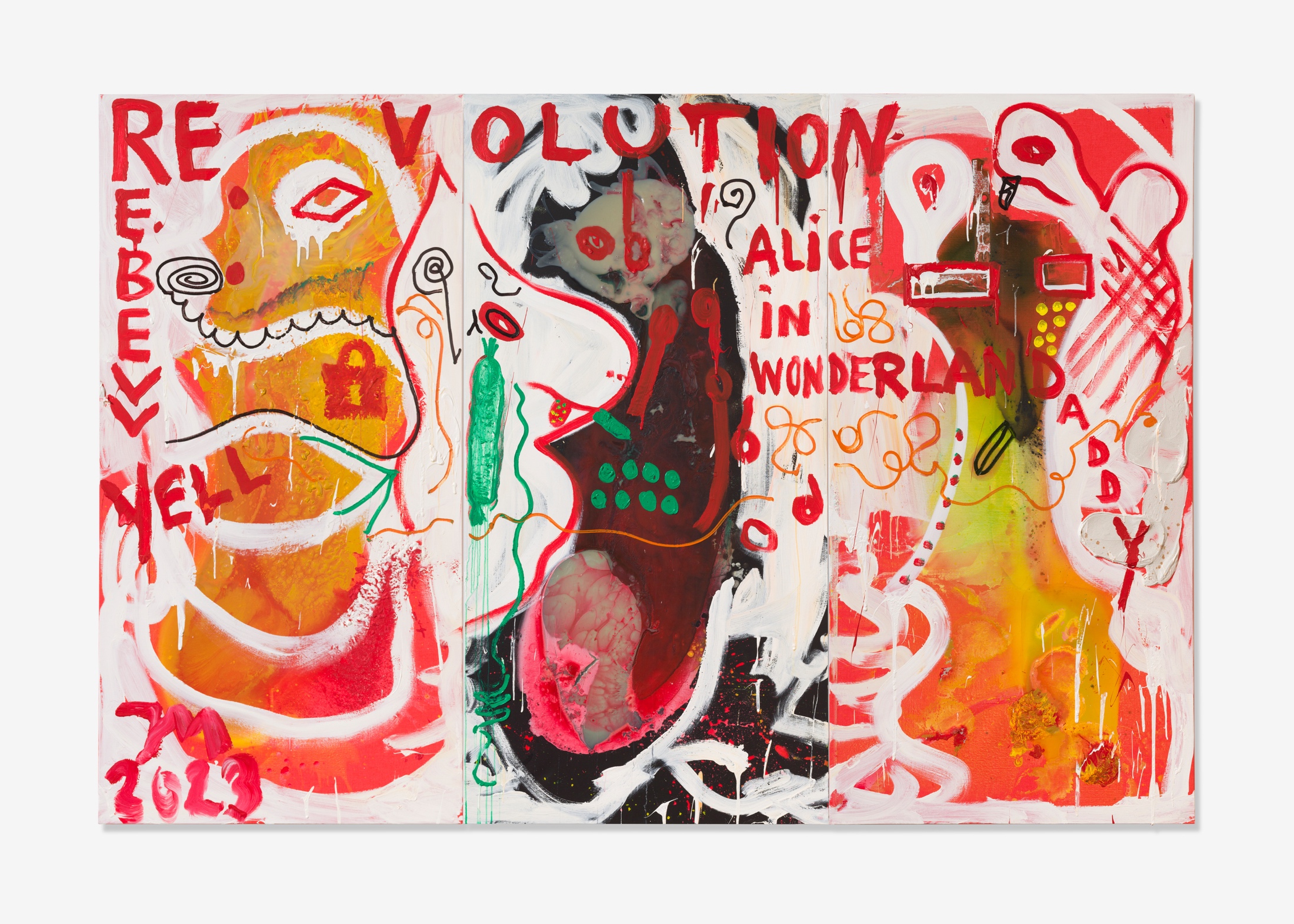 Né en 1970 à Tokyo, Jonathan Meese est allemand et vit à Berlin. Il a développé une œuvre inclassable, entre expressionnisme et actionnisme, qui associe peinture, sculpture, installation et performance. Mêlant références historiques, légendaires, de science-fiction, sa mythologie personnelle convoque des personnages aussi variés que Fantomas, Maldoror ou Staline ; autant d’avatars de l’identité de l’artiste. Son œuvre appelle à la « dictature de l’art ».