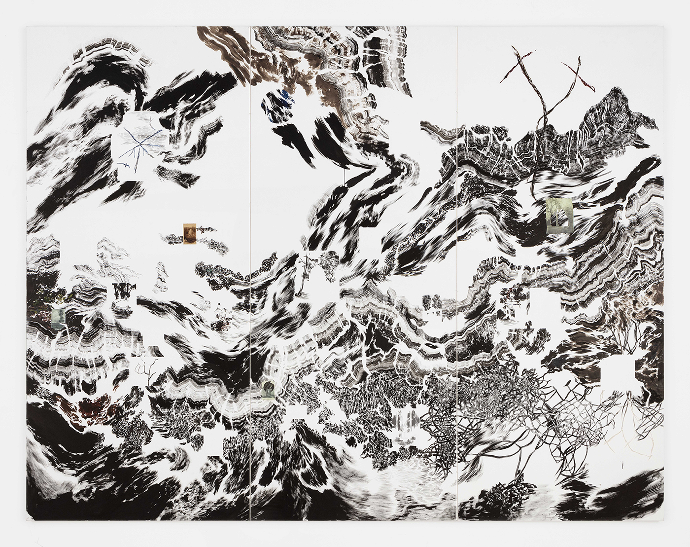 Ses vastes fresques éphémères sont réalisées directement à l’encre sur les murs, transformant les architectures en un ailleurs, un monde de flux et de paysages mentaux, entre le reconnaissable et l’indiscernable, à la frontière entre le physique et le symbolique. Réflexion sur les ressorts de la perception, ses œuvres explorent nos systèmes de connaissance, la survivance des mythes et des croyances, mais aussi les réminiscences, persistances rétiniennes ou neuronales que ce soit sur les murs des musées ou sur des feuilles de papier.