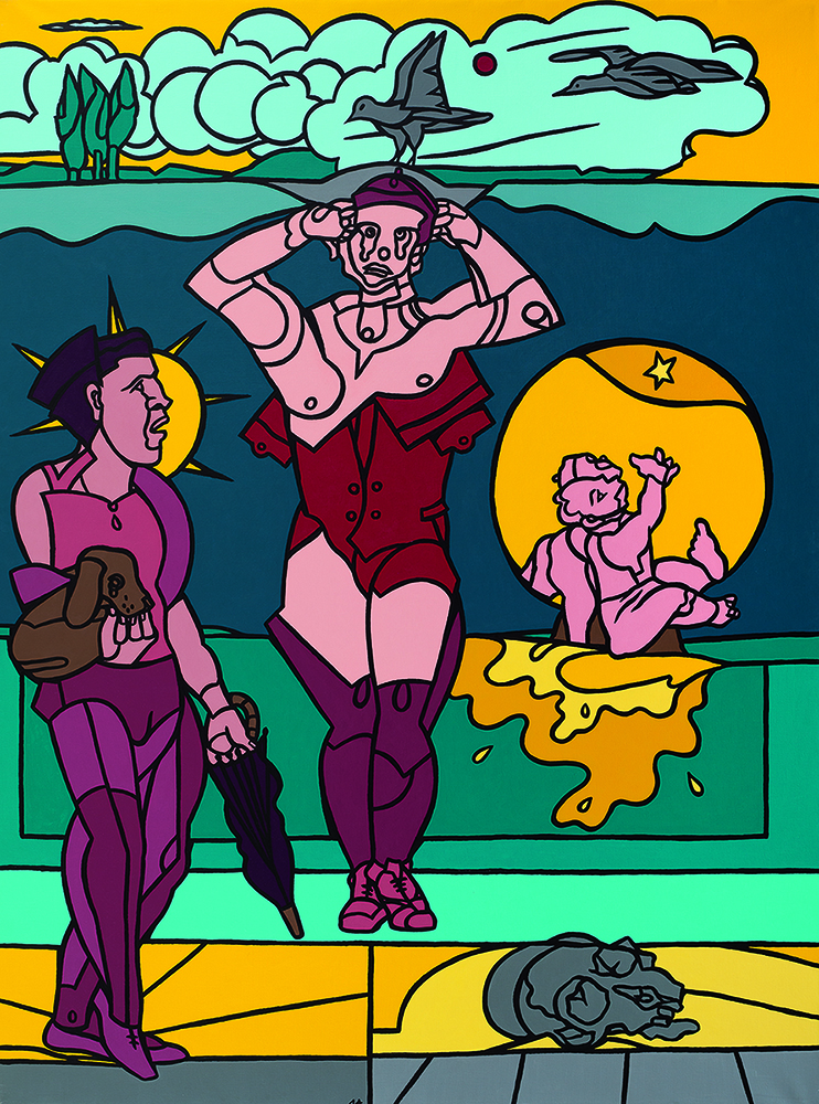 Né en 1935 à Bologne, Valerio Adami est une figure incontournable de la Figuration Narrative. Sa peinture se caractérise par des aplats colorés cernés de noir et évoque les voyages, la musique, la littérature ou le théâtre. L’énigme, scandée de nombreuses références littéraires, occupe toujours une place centrale dans son travail qu’il définit comme une interrogation philosophique avec le verbe.