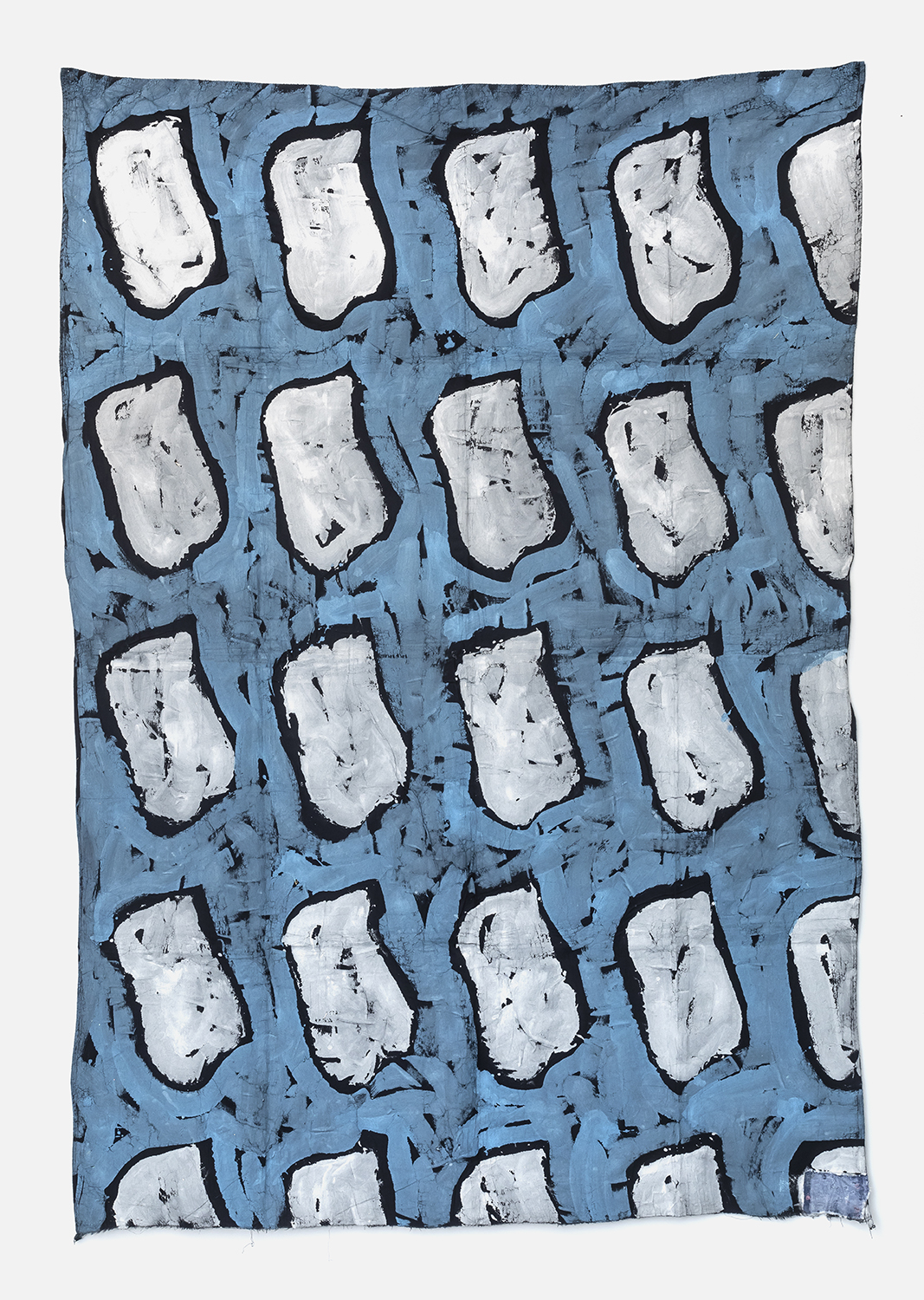 Claude Viallat est né en 1936 à Nîmes, où il vit et travaille aujourd’hui. Il est l’un des fondateurs de « Supports/Surfaces » dans les années 1970, mouvement qui appelle à un renouvellement de l’art par la remise en question des matériaux traditionnels. Viallat commence ainsi à travailler sur des bâches industrielles, sur lesquelles il répète à l’infini une même forme abstraite, sorte d’osselet devenu sa signature. Répété au pochoir sur divers supports, ce motif ouvre une réflexion sur le sens du geste créatif et le statut « d’œuvre d’art ».