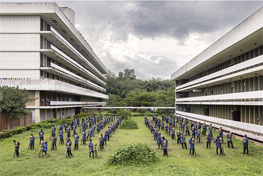 Jitish Kallat présente l’installation sculpturale Untitled (Two Minutes to Midnight). Cette grande installation réunit deux points de repère soigneusement choisis, l’un de notre passé préhistorique et l’autre d’un futur prophétique. Les sculptures sont placées sur un socle qui reprend les contours de l’emblématique « Doomsday Clock » qui, depuis 1947, représente une hypothétique catastrophe mondiale d’origine humaine à « midnight”. Depuis sa création, l’horloge a été réglée chaque année 23 fois en avant et en arrière pour indiquer les menaces que En outre, il présente une installation de papier peint spécifique au site, intitulée Integer Integer Studies (Drawing from Life), comprenant 365 dessins, produits quotidiennement pendant l’année pandémique 2021.