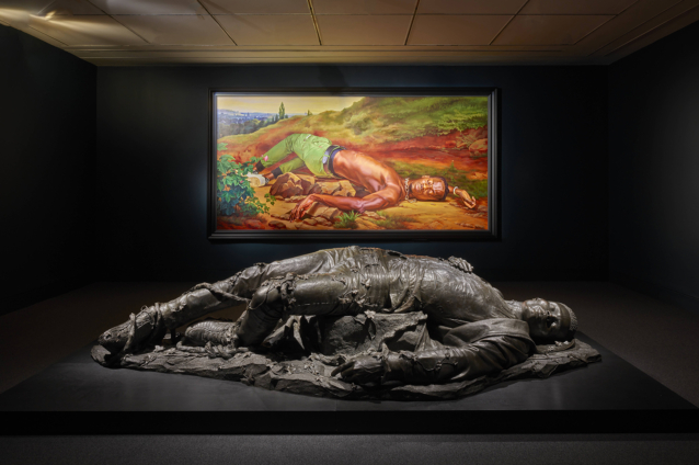 Iniatialement inspirée par la peinture de Holbein, Le Christ mort dans le tombeau, ainsi que par des peintures et sculptures historiques de guerriers et de personnages tombés au combat dans l’état de repos, Wiley a créé une série troublante de corps noirs couchés, reconceptualisant les formes les formes picturales classiques pour créer une version contemporaine du portrait monumental, résonnant de violence, de douleur et de mort, ainsi que d’extase.