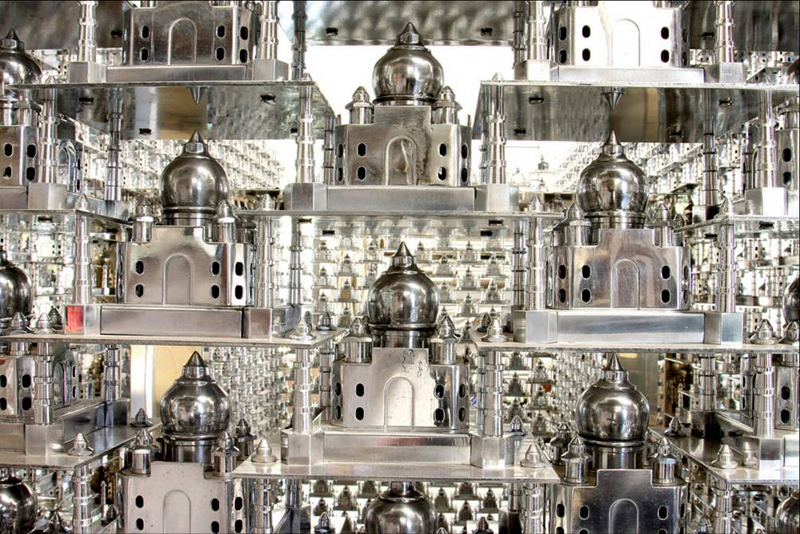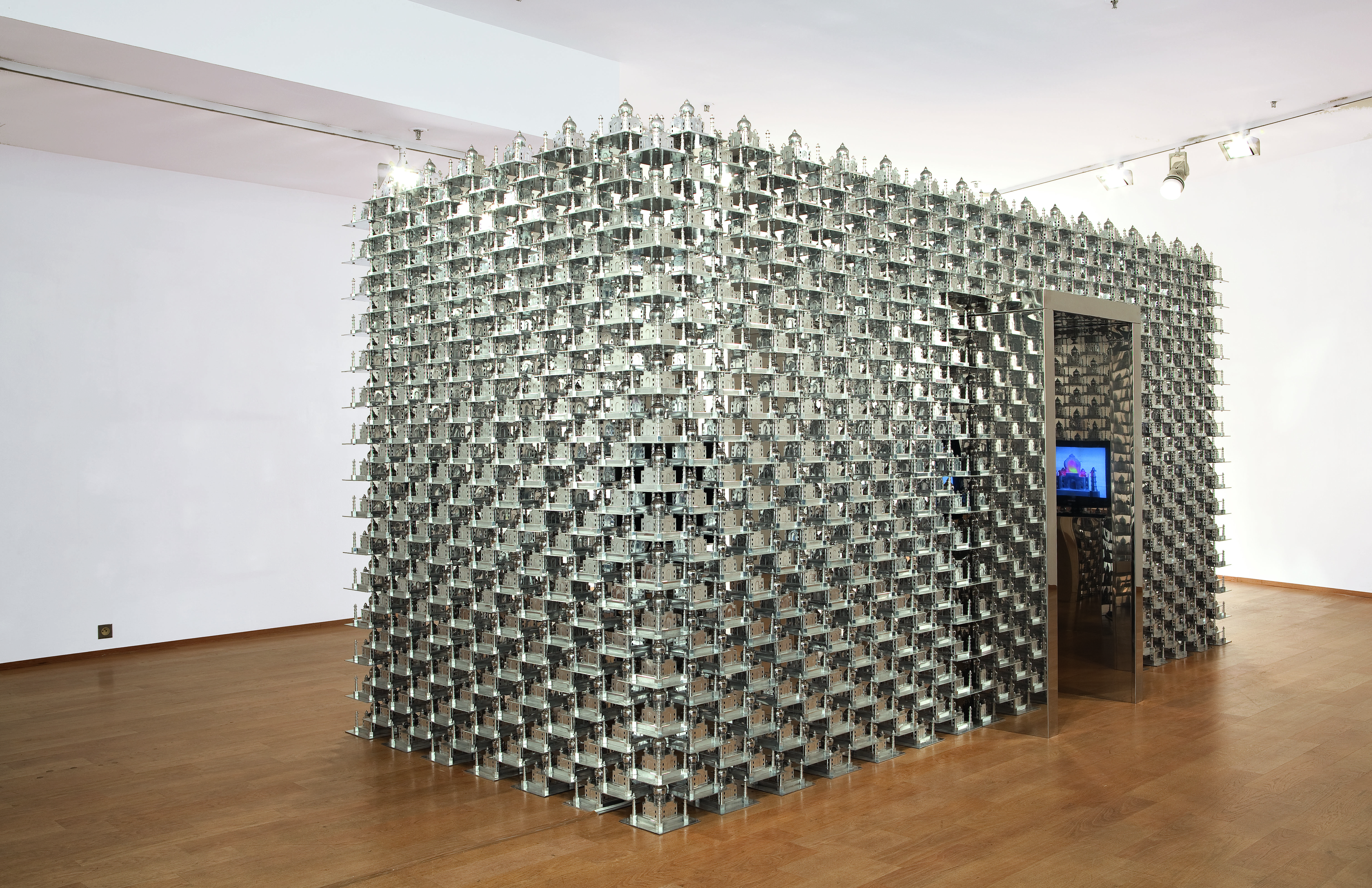 Pour cette installation, l’artiste a bâti à l’aide de centaines de mini Taj Mahal métalliques, une pièce où les visiteurs découvrent une vidéo montrant ces mêmes objets-souvenirs en flammes.
