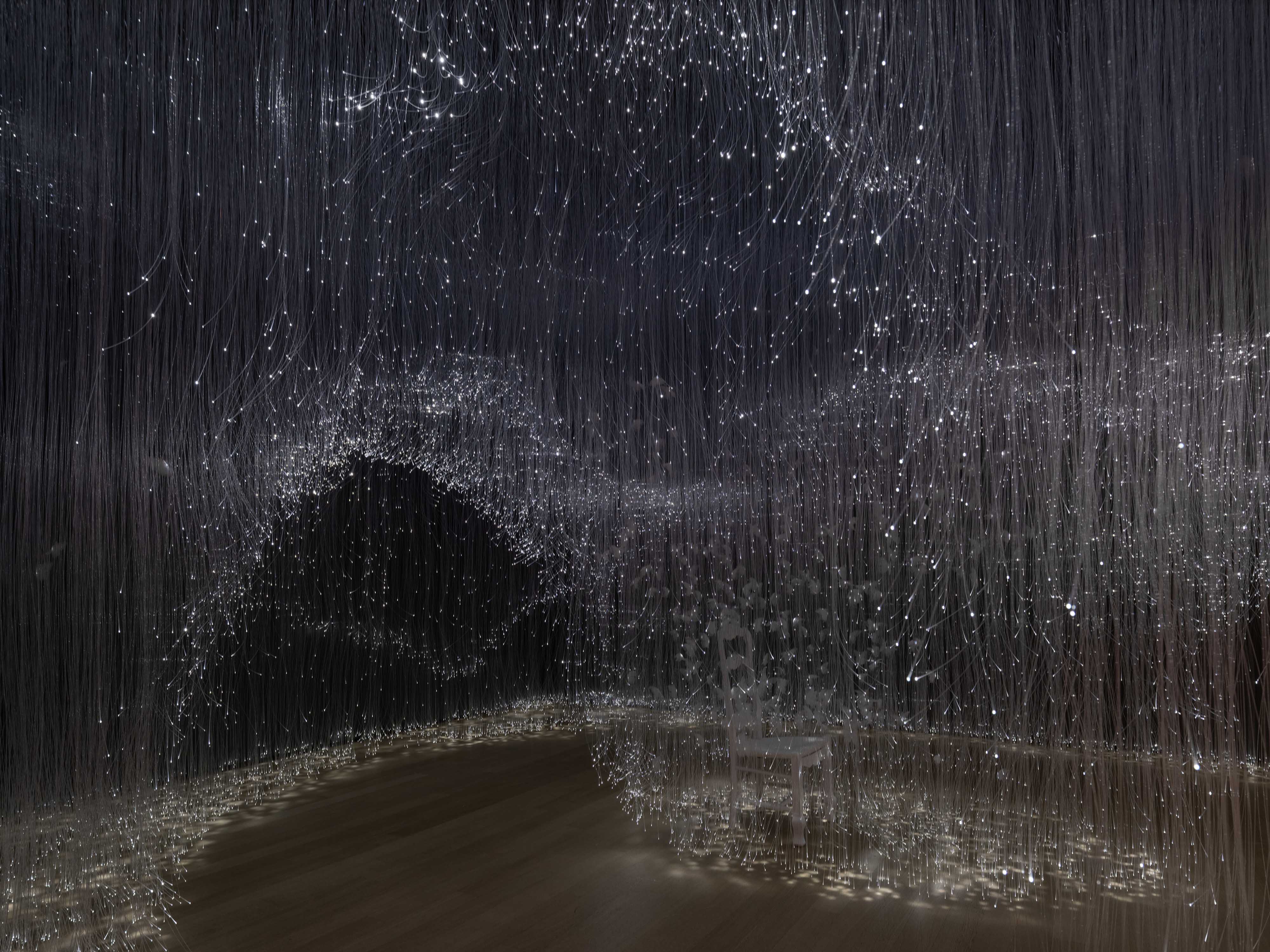 Avec Echoes Between, Chiharu Shiota explore l’univers de la mort, espace incertain où la conscience s’évade et se transforme. Autour de deux chaises, symbole de repos et de voyage intérieur, des milliers de fils lumineux forment une nuée vibrante, comme une pluie de particules vivantes offrant une connexion incessante entre réel et imaginaire.