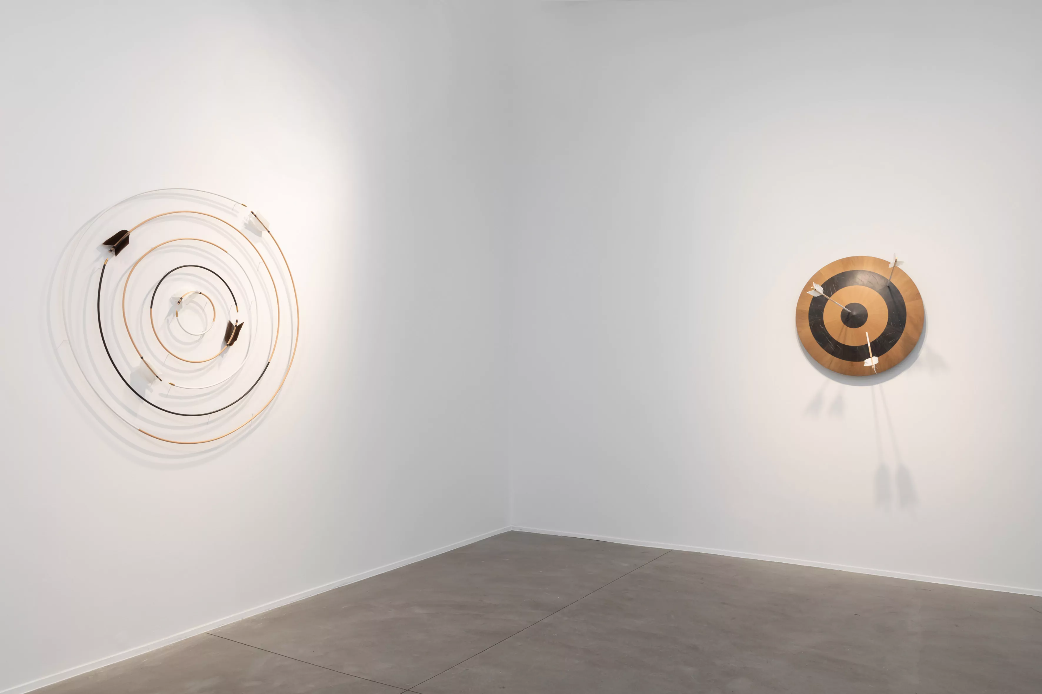 La dernière pièce clôt l’exposition sur une note différente, à travers deux oeuvres presque « aériennes », composées de flèches cintrées en bois de hêtre et ornées de plumes. Si en Infinite I (Arrows) résonne le célèbre signe mathématique, véritable ode au mouvement pérenne et au chiffre « 8 », symbole d’équilibre et perpétuelle renaissance ; Target I (Arrows), quant à elle, capte immédiatement l’attention du visiteur par un ensemble de cinq flèches concentriques pour former une cible en noir et blanc.