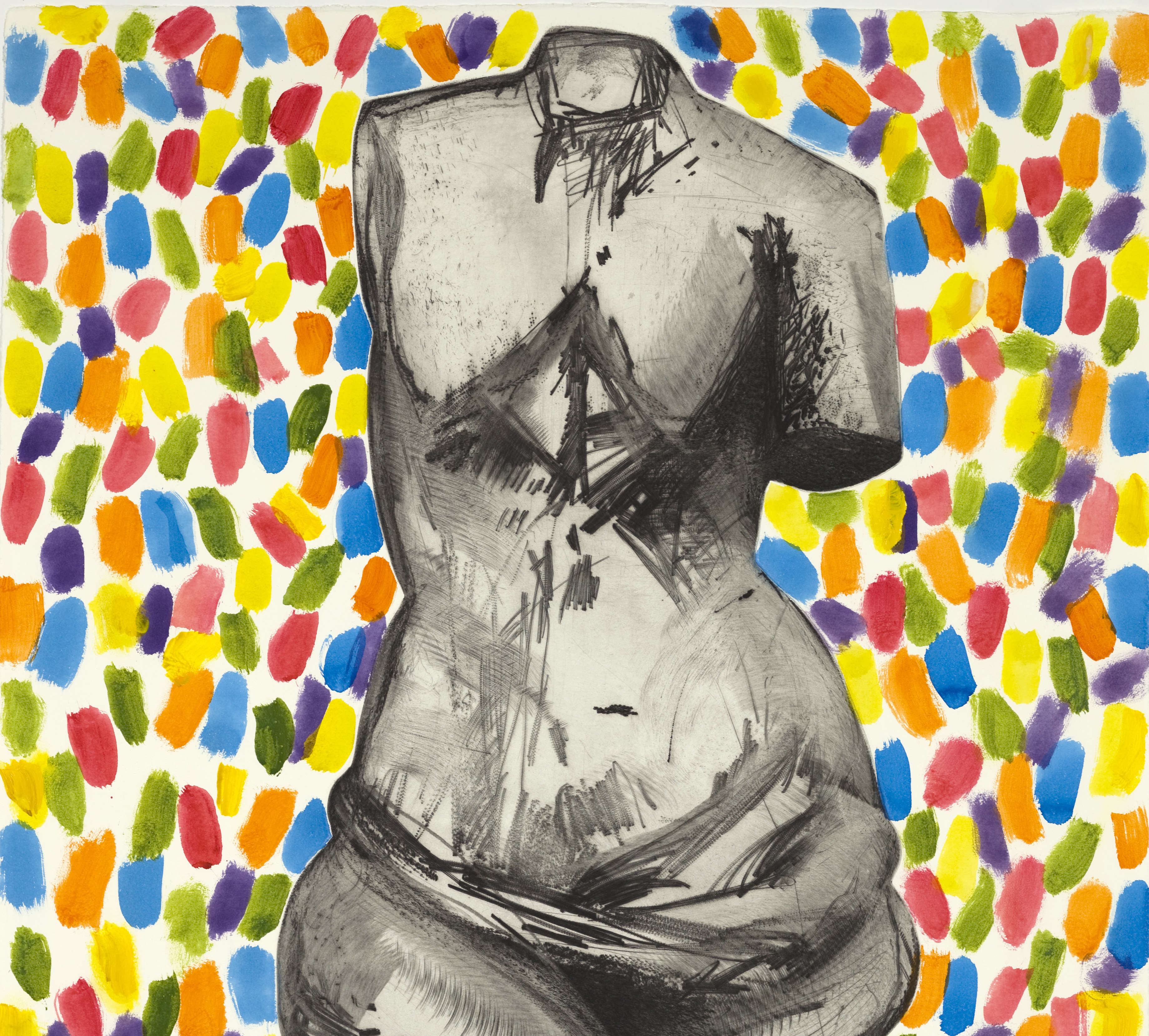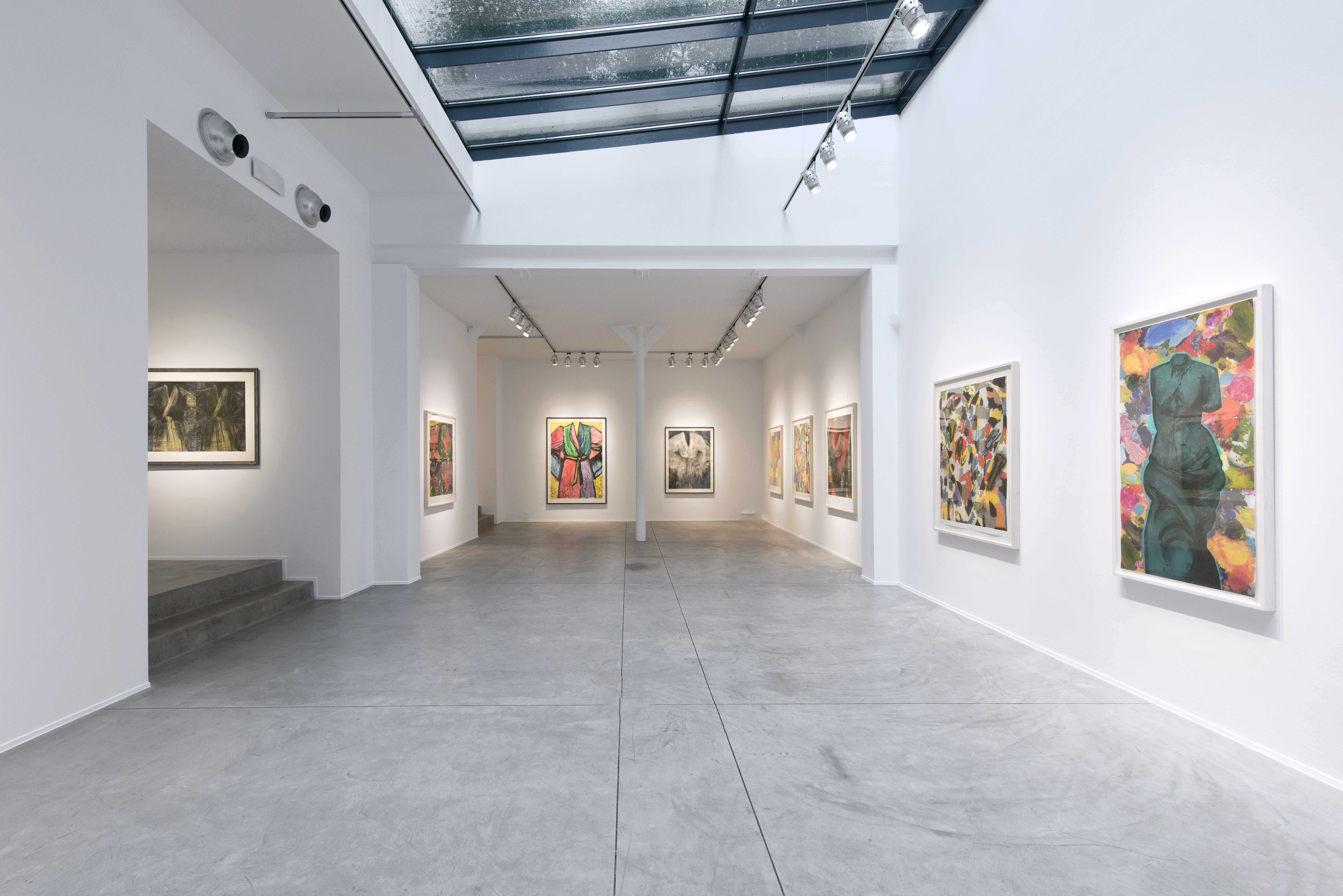 La vingtaine d’œuvres créées entre 1981 et 2015, et rassemblée ici témoigne de cette jubilation de la découverte et du plaisir de la déclinaison sur quelques thèmes choisis. Le cœur, symbole de la palette et du féminin, côtoie les fantomatiques robes de chambre, forme d’autoportraits masqués, auxquels répondent des Vénus de Milo, figures éternelles de la culture occidentale et de mondes révolus.