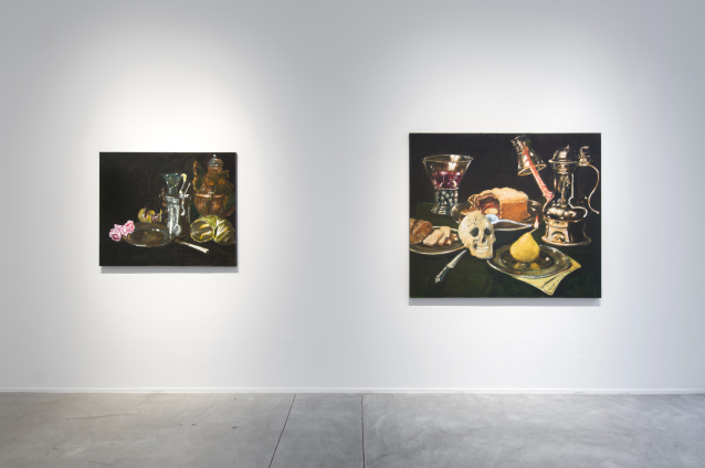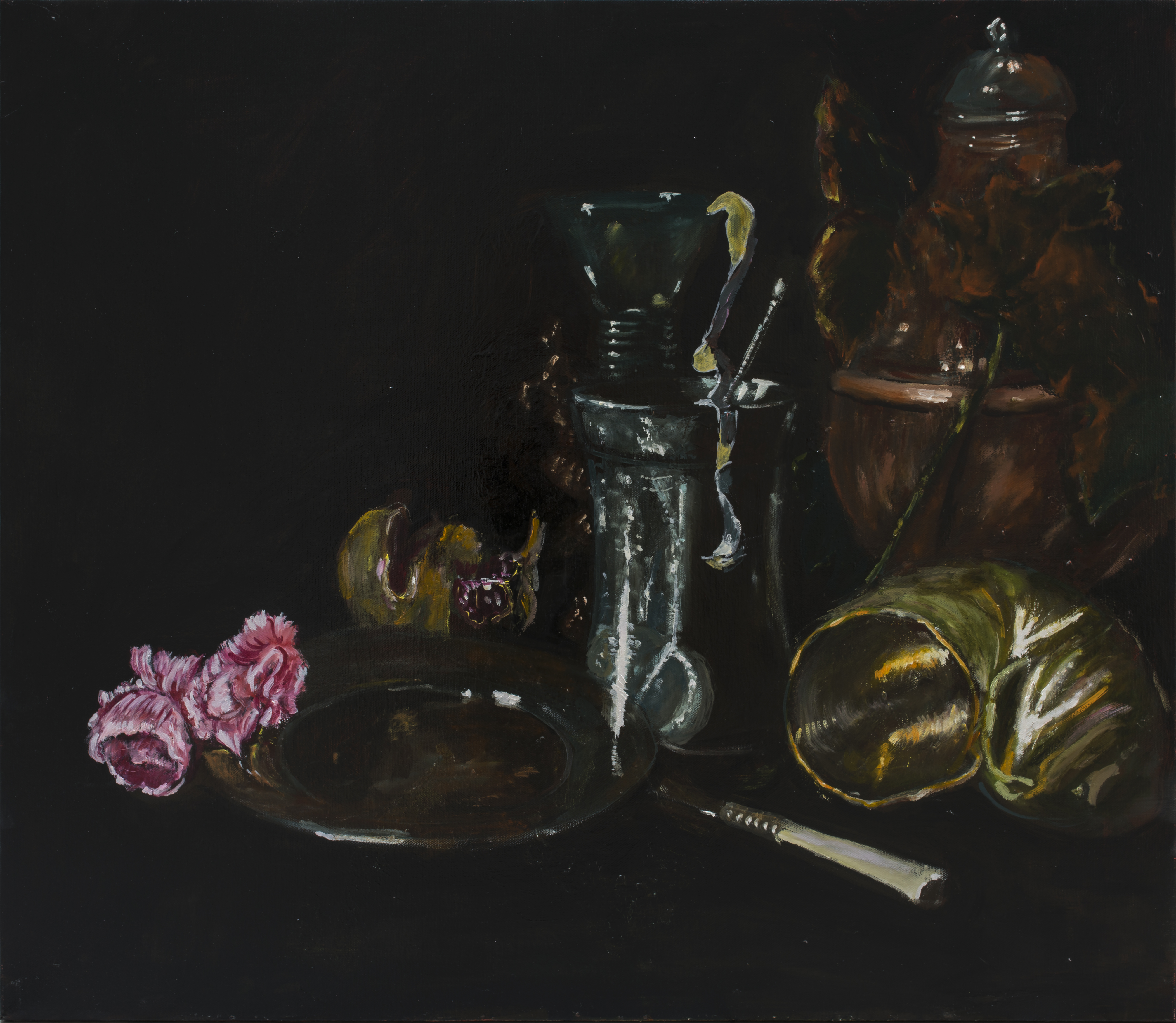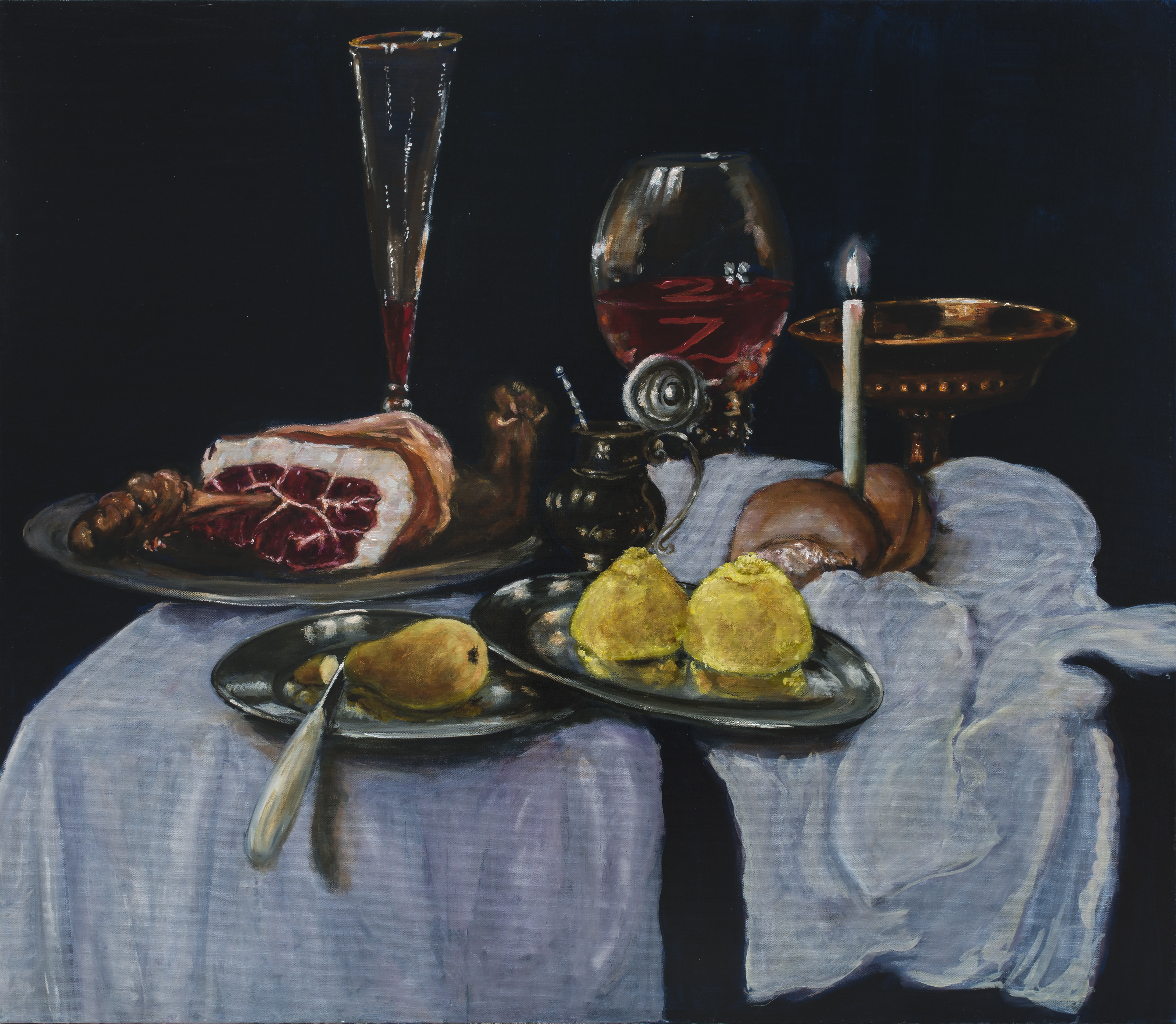 Dans Le bouillon de onze heures, Van Imschoot s’intéresse à la peinture de l’École du Nord du XVIIè siècle. L’artiste a choisi de puiser dans l’univers silencieux d’un des maîtres du genre : Willem Claeszoon Heda. Se situant dans la lignée des plus grands peintres flamands, Van Imschoot adapte la nature morte à son univers singulier pour lui rendre ses lettres de noblesse grâce à sa virtuosité et sa maîtrise du sujet.