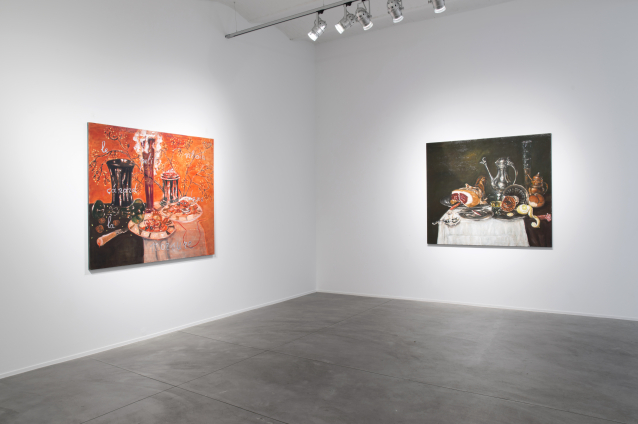 L’exposition propose ainsi des toiles au propos ambigu. On y voit une somptueuse cafetière couverte d’un verre de cristal accompagnée de lettres rouge-sang : «le viol ». Une ripaille d’antan se fond dans un paysage de mer agitée. Une coupe à vin se dresse, décalée, aux côtés d’un paquet de cigarettes. Le titre-même de l’exposition « Le bouillon de onze heures » est à double tranchant. Il désigne le dernier repas, tantôt empoisonné, tantôt réconfortant, d’un mourrant.