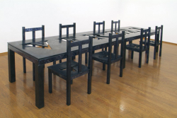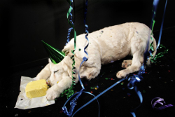 2006Chiens empaillés, confettis, rubans, beurre et tableDimensions variables