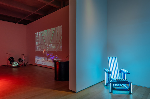 Ce parcours s’ouvre ainsi avec Landless Land, film muet réinterprétant l’installation Homeless Lamp, The Juice Sucker (2004-2005), aujourd’hui conservée dans les collections du Solomon R. Guggenheim Museum de New York. La lumière y devient une condition de survie plutôt qu’un simple moyen d’éclairage, une métaphore de l’espoir et du déplacement. Conçue à la même période, Blue Electric Chair (2004) introduit l’un des axes majeurs du travail de Navarro : la contestation politique. En transposant un objet intimement lié à la violence institutionnelle en une structure lumineuse, l’oeuvre établit un dialogue avec l’histoire du design moderne tout en interrogeant les mécanismes du pouvoir, de la répression et du contrôle.