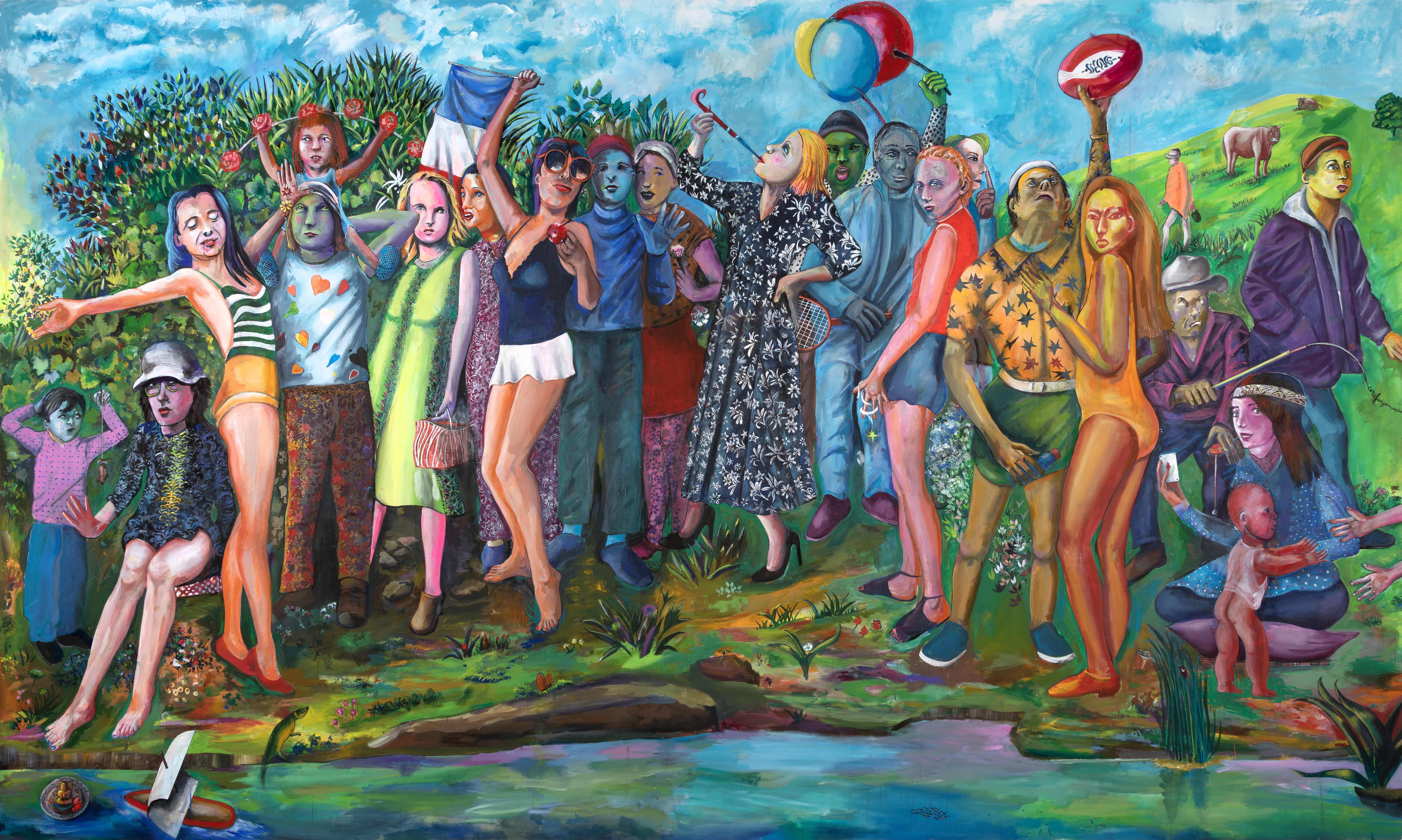 Pour cette deuxième grande exposition en dix ans – depuis la rétrospective que lui avait dédiée le Centre Pompidou en 2014 – Martial Raysse déploie des toiles d’une densité saisissante. Trois vastes formats, flirtant avec l’ambition et la dramaturgie de la peinture d’histoire, dialoguent avec une série de figures féminines allégoriques. Parmi elles, Le Grand Jury (2022), La Peur (2023), longue de quatre mètres et traversée par des réminiscences de la guerre en Ukraine ainsi que par des souvenirs d’enfance de l’artiste, et son pendant féerique La Paix (2023), vaste fresque de cinq mètres dévoilée lors d’Art Basel Paris en octobre dernier.