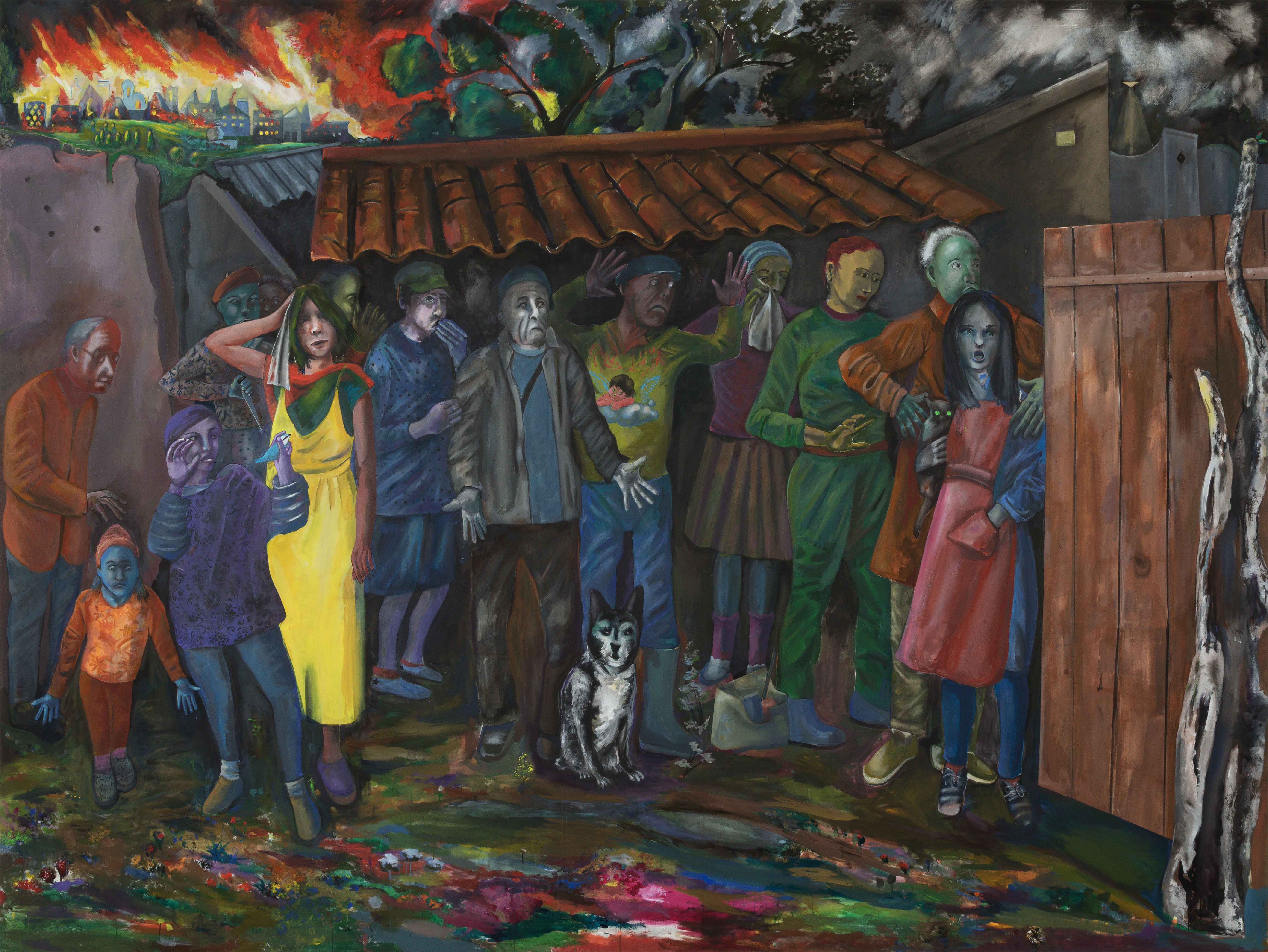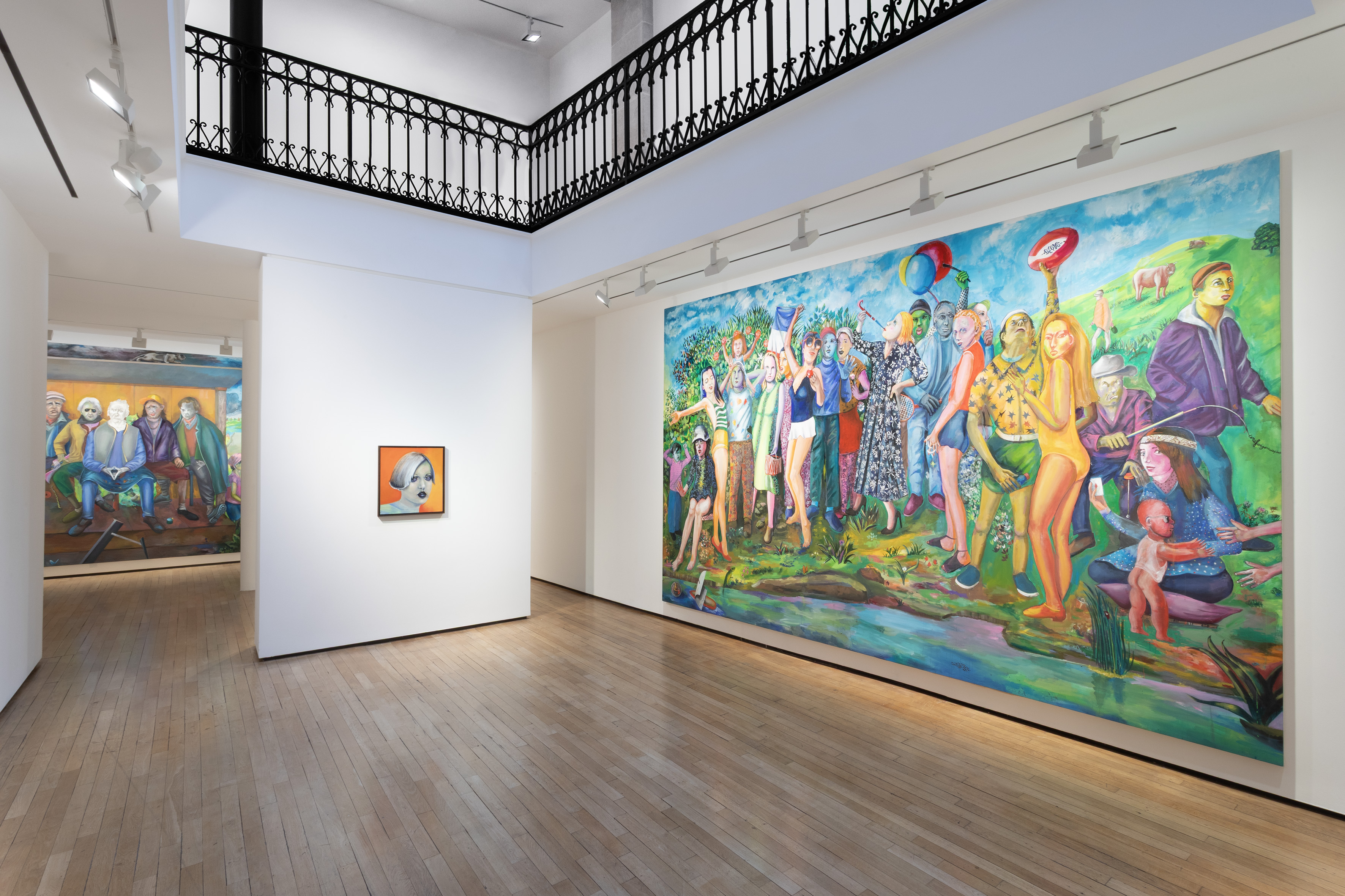 Pour cette deuxième grande exposition en dix ans – depuis la rétrospective que lui avait dédiée le Centre Pompidou en 2014 – Martial Raysse déploie des toiles d’une densité saisissante. Trois vastes formats, flirtant avec l’ambition et la dramaturgie de la peinture d’histoire, dialoguent avec une série de figures féminines allégoriques. Parmi elles, Le Grand Jury (2022), La Peur (2023), longue de quatre mètres et traversée par des réminiscences de la guerre en Ukraine ainsi que par des souvenirs d’enfance de l’artiste, et son pendant féerique La Paix (2023), vaste fresque de cinq mètres dévoilée lors d’Art Basel Paris en octobre dernier.