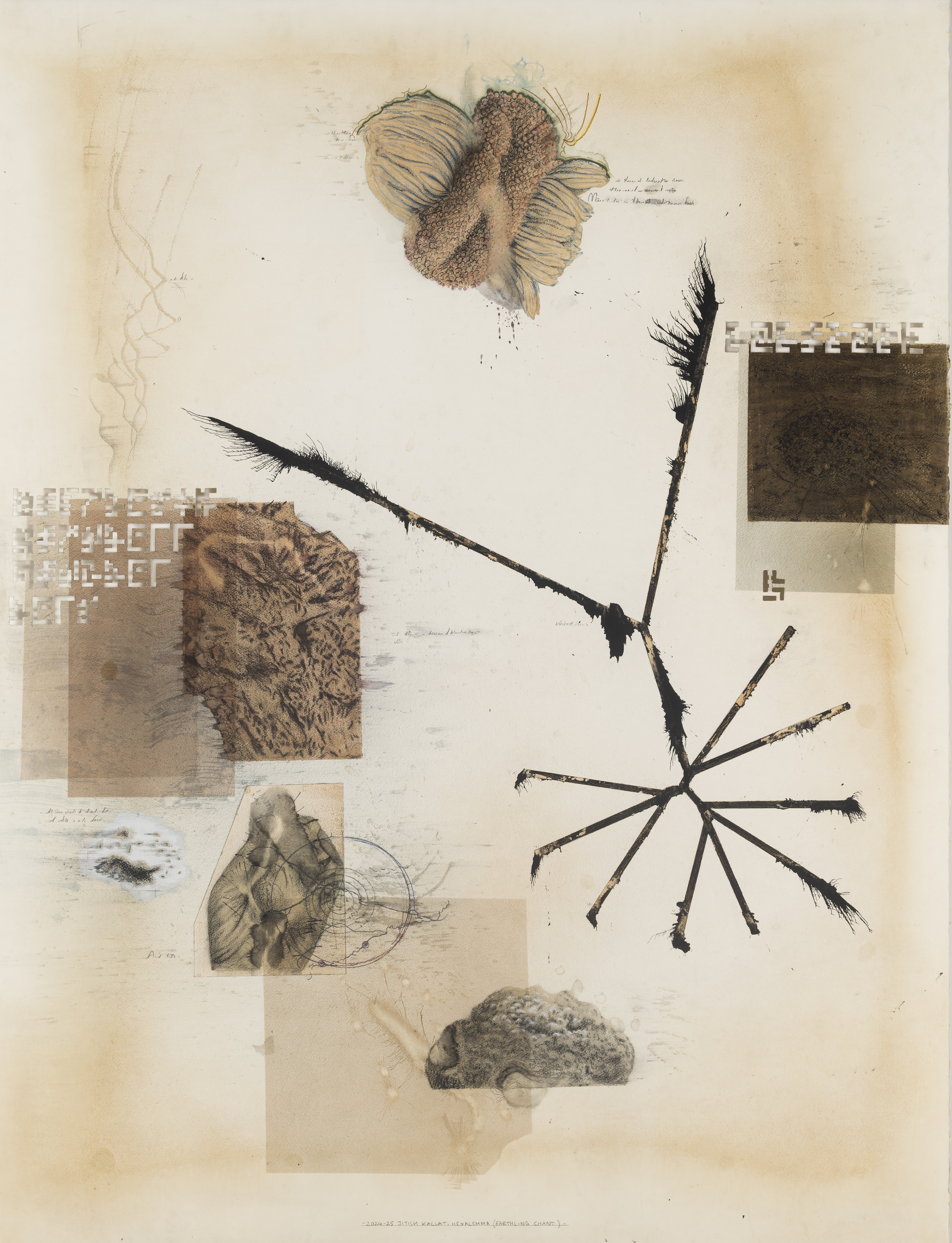Le parcours se prolonge à l’étage inférieur, où Hexalemma (Earthling Chant) inscrit l’exposition dans une perspective sensible, reliant les visions cosmiques et les systèmes abstraits à l’expérience humaine. Un assemblage d’images, tirées des notes de recherche de l’artiste et de références d’atelier, s’entrelace avec un message interstellaire codé, incarnant une adresse planétaire envoyée depuis un monde divisé. Un arbre phylogénétique abstrait, habituellement symbole d’évolution et de filiation, est pris dans une bourrasque invisible ; sa logique de descendance, habituellement linéaire, s’en trouvant bouleversée. Des fleurs striées, des cavités d’explosions nucléaires et des mains modelant la terre convergent avec des visions de bouleversements planétaires, évoquant la précarité, la mutation et le paradoxe à travers un prisme cosmique.