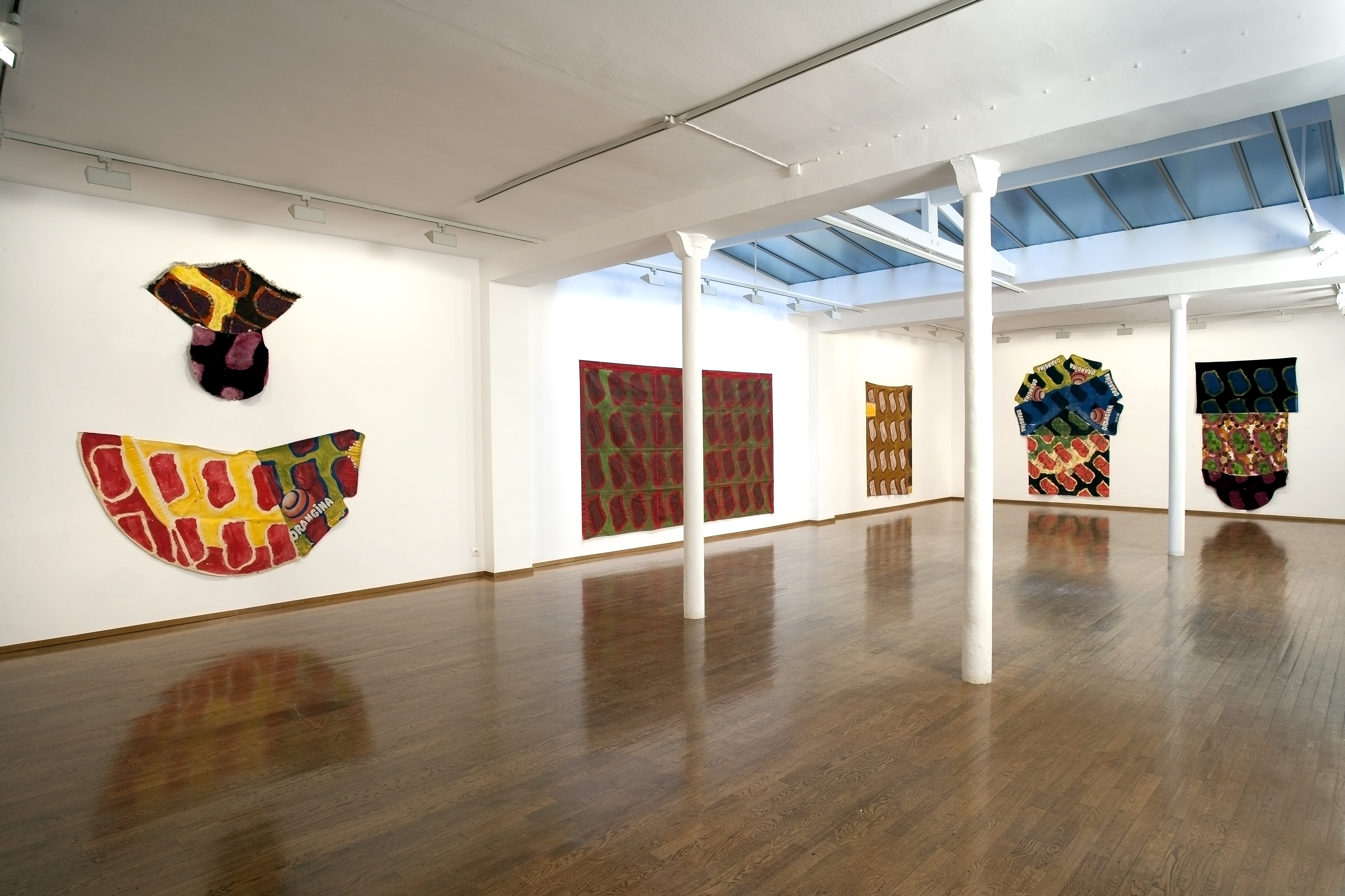 L’exposition présente également une seconde série de toiles constituées de raboutages de culs de fauteuils, de parasols, de tentes, formant des toiles composites aux dimensions improbables. Après avoir présenté régulièrement des formats rectangulaires à la Galerie Daniel Tempon « j’ai eu l’envie d’éclater la surface et l’espace » explique l’artiste, « …ce qui compte, c’est la manière dont les couleurs jouent avec les couleurs qui sont en dessous, comment d’une manière intuitive et non voulue, non prévue, j’arrive à organiser une surface en densité, en intensité. »