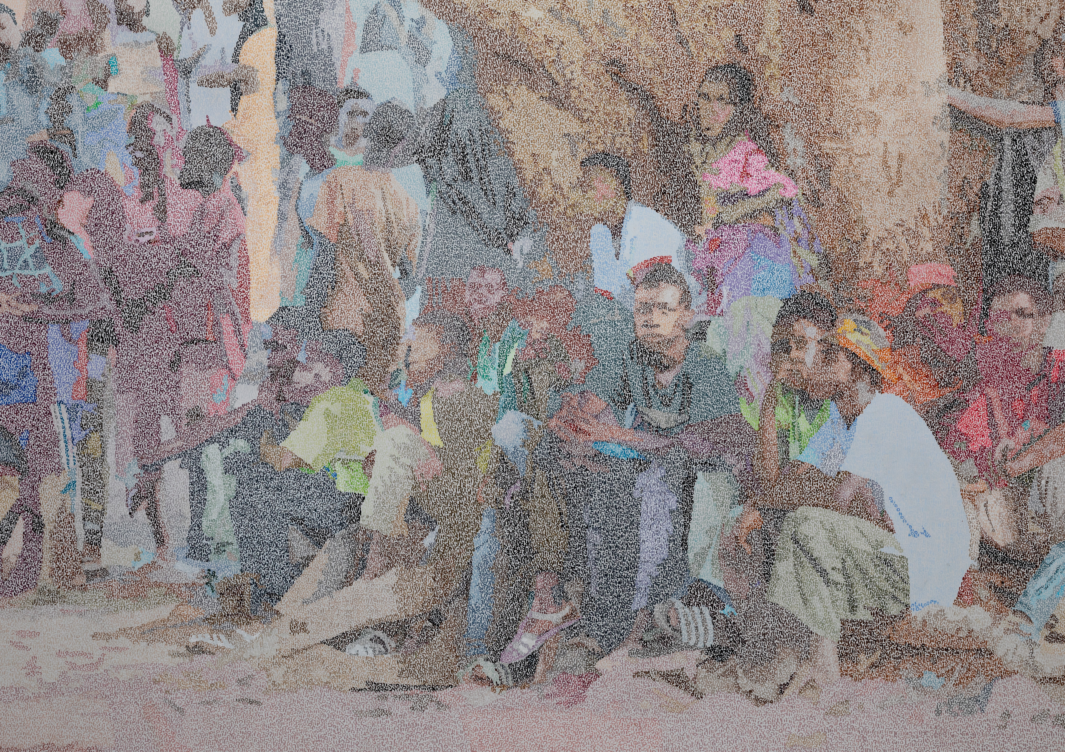 Au plus près de ces communautés, l’artiste a patiemment observé, documenté puis réinterprèté ces traditions à travers son langage plastique si singulier. Sa technique, progressivement élaborée au fil des années, repose sur l’assemblage de petits modules qu’il nomme « signes inconscients » : agrégés les uns aux autres, ils composent des scènes figuratives d’une grande intensité. Masques, danses, costumes, musiques et chants sont ainsi transposés en peinture, dans une tentative de saisir l’énergie vibrante et l’essence spirituelle de ces cérémonies.