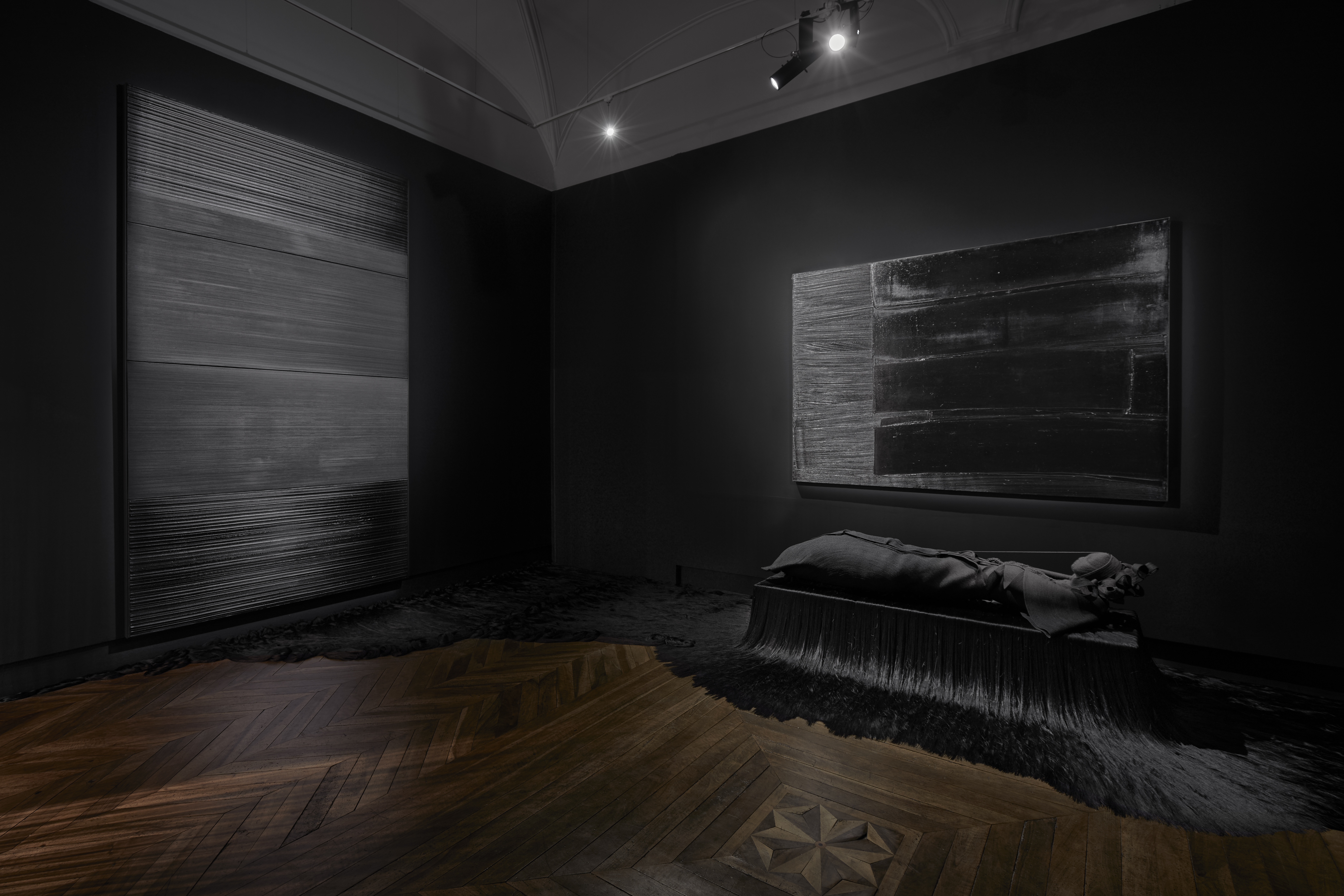 The Museum of Old Nîmes is the setting for a posthumous pairing between emerging textile artist Jeanne Vicerial and the celebrated painter who recently passed away: Pierre Soulages. The painter’s research was particularly important to Jeanne Vicerial. Upon discovering his work, she realized that black, when combined with repetitive gestures, opens infinite possibilities. For it is not about black in the end, but about light and doors to other worlds. In this unprecedented face-to-face encounter, Jeanne Vicerial pays tribute to the master in the city where he passed away. Several of their works engage in dialogue within a multisensory installation she created entirely on site, and which required her to live in the museum for a month with her team and fashion students from High school Ernest Hemingway in Nîmes. The experience is as much about rebirth and metamorphosis as it is about the state of anteriority that precedes birth, the last memory before life begins. Feminine presences and Outrenoirs punctuate this journey from white to black and back again, highlighting the many parallels between the two artists’ practices. The threads and furrows created by the brush sometimes appear to interchange. Here, they embody both the passage of time and the fragility of destinies.