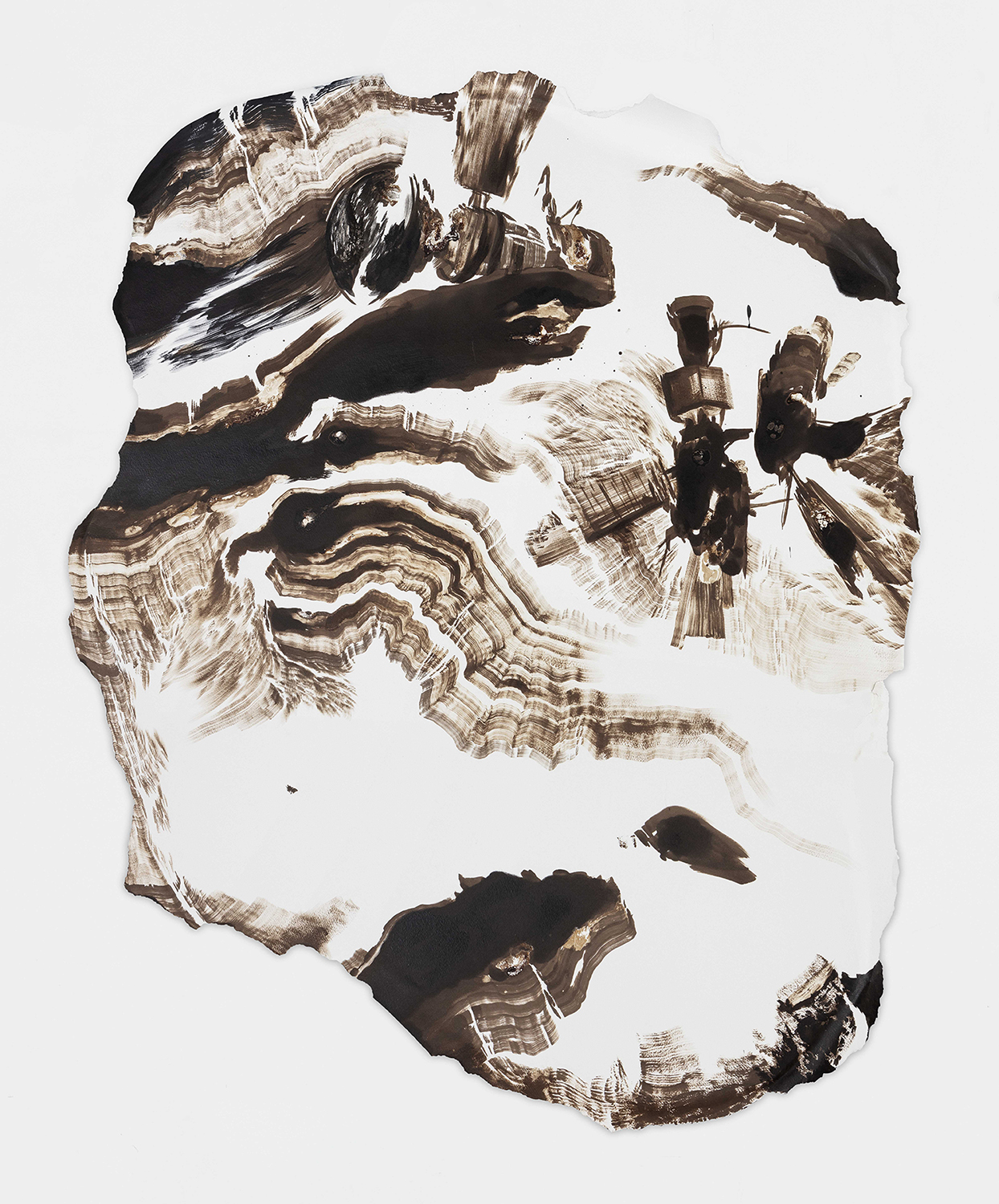 His vast ephemeral frescoes are painted directly onto walls with ink, transforming architecture into an otherworld, a world of flux and mental landscapes, between the recognizable and the indiscernible, on the border between the physical and the symbolic. Reflecting on the workings of perception, his works explore our systems of knowledge, the survival of myths and beliefs, but also reminiscences, retinal or neuronal persistence, whether on museum walls or sheets of paper.