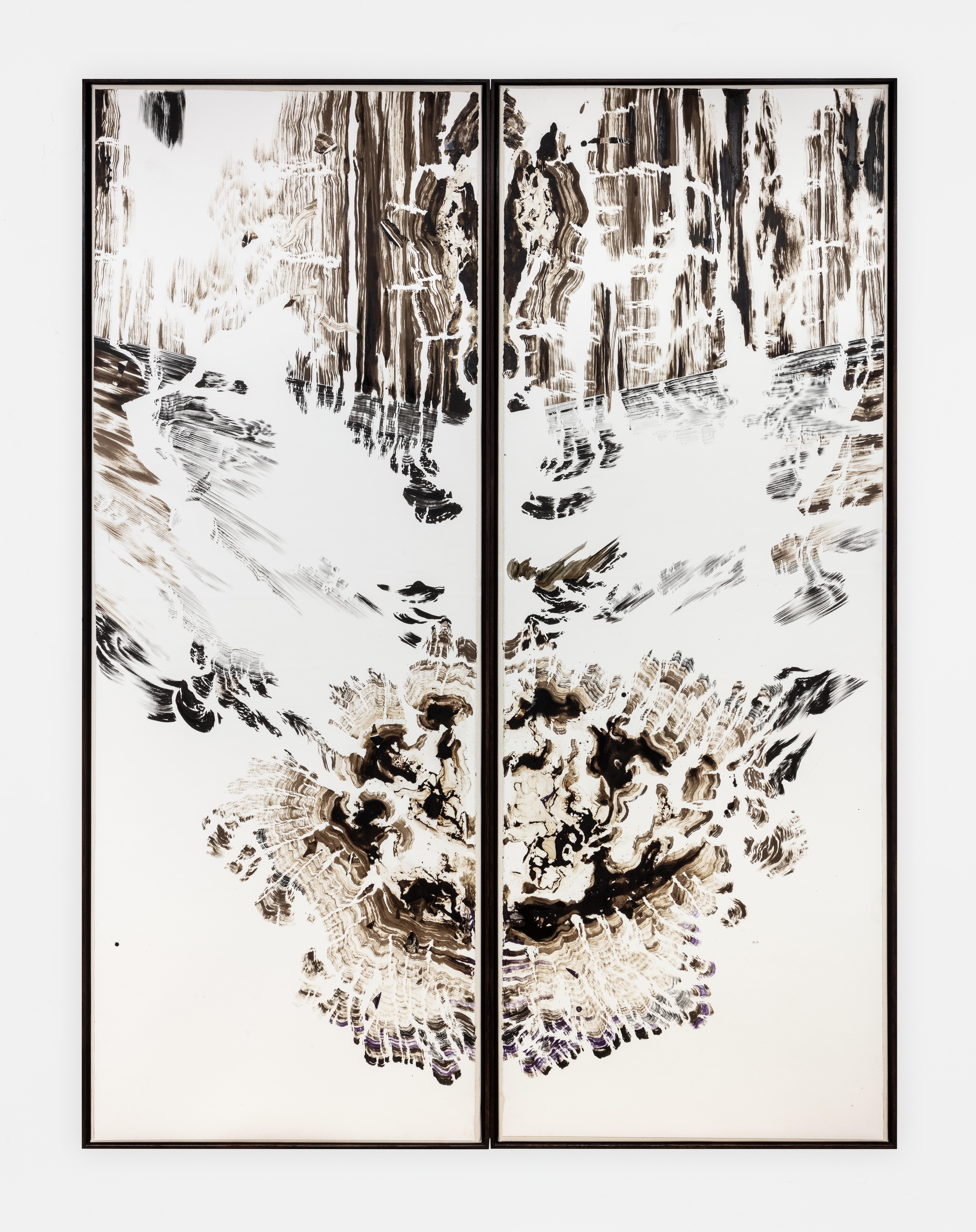 His vast ephemeral frescoes are painted directly onto walls with ink, transforming architecture into an otherworld, a world of flux and mental landscapes, between the recognizable and the indiscernible, on the border between the physical and the symbolic. Reflecting on the workings of perception, his works explore our systems of knowledge, the survival of myths and beliefs, but also reminiscences, retinal or neuronal persistence, whether on museum walls or sheets of paper.