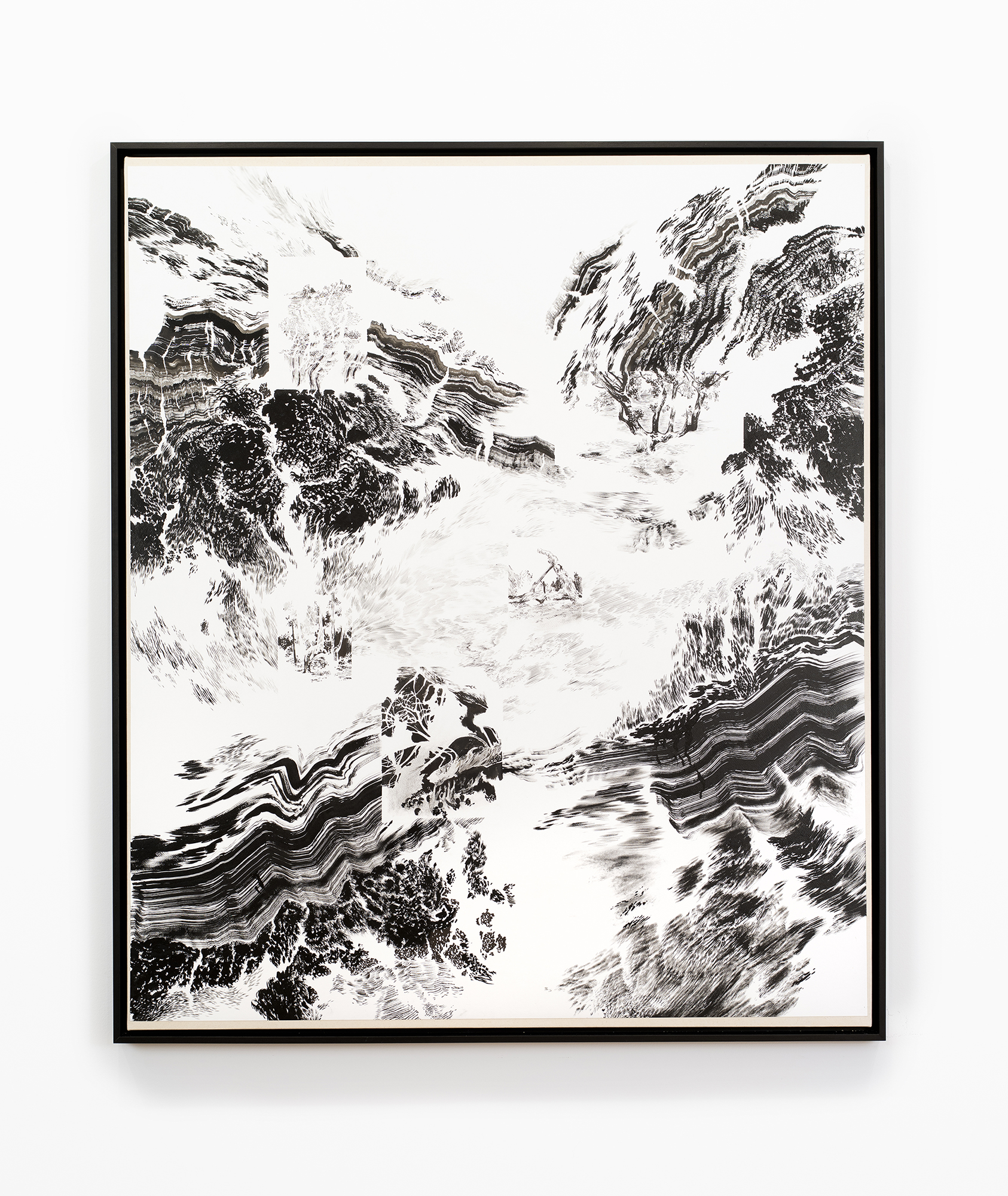 His vast ephemeral frescoes are painted directly onto walls with ink, transforming architecture into an otherworld, a world of flux and mental landscapes, between the recognizable and the indiscernible, on the border between the physical and the symbolic. Reflecting on the workings of perception, his works explore our systems of knowledge, the survival of myths and beliefs, but also reminiscences, retinal or neuronal persistence, whether on museum walls or sheets of paper.