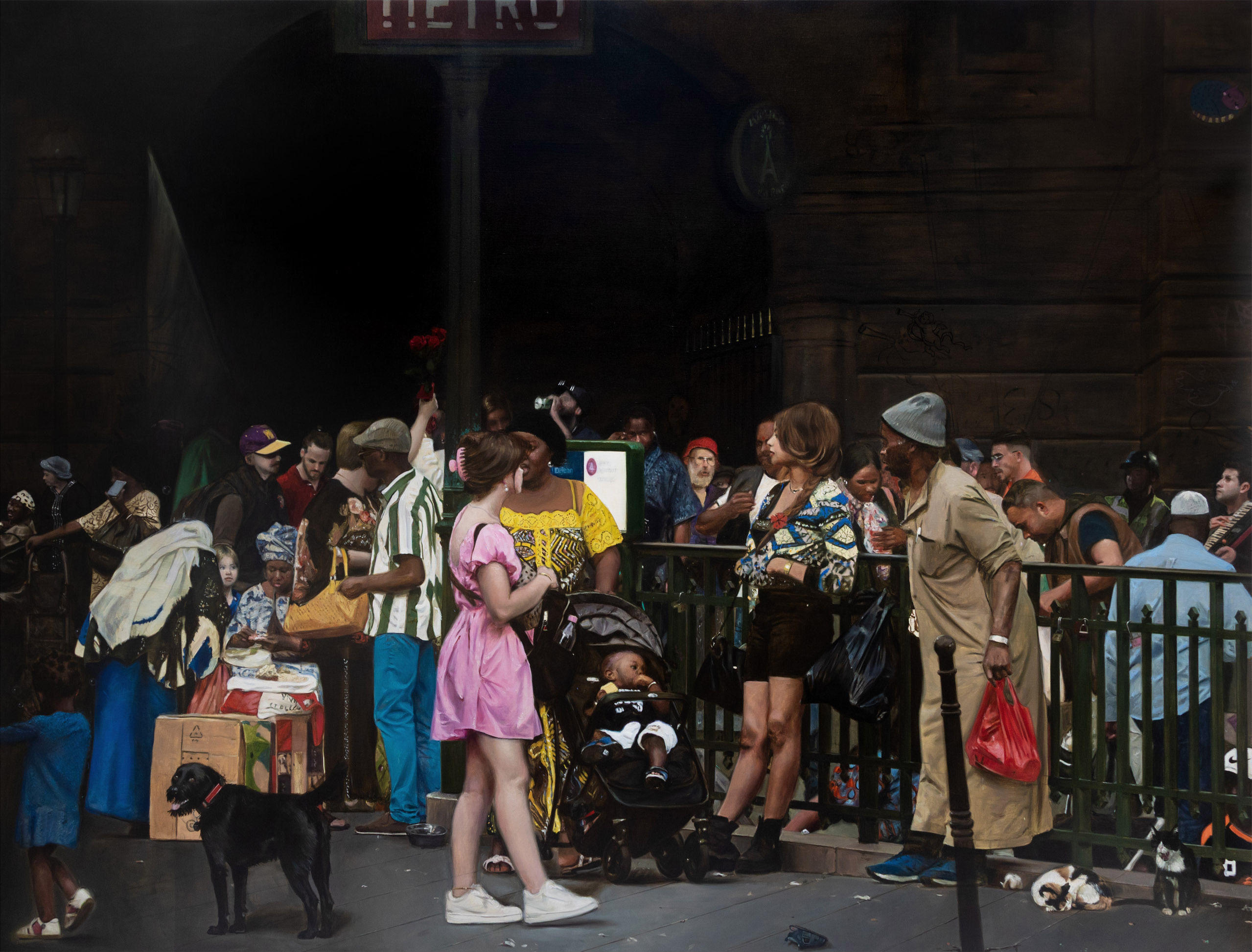 His large-scale oil paintings, based on photographs, serve as contemporary interpretations of urban scenes. By contrasting anonymity and intimacy, his work portrays a poignantly realistic, universal metropolitan experience. The latter, is paired with a commitment to shed light on the invisible, with a technique formed through a variety of inspirations, from Hopper to Rubens, via the Impressionists. In this way, he explores the complexities of Parisian society, from solitude to cultural diversity.