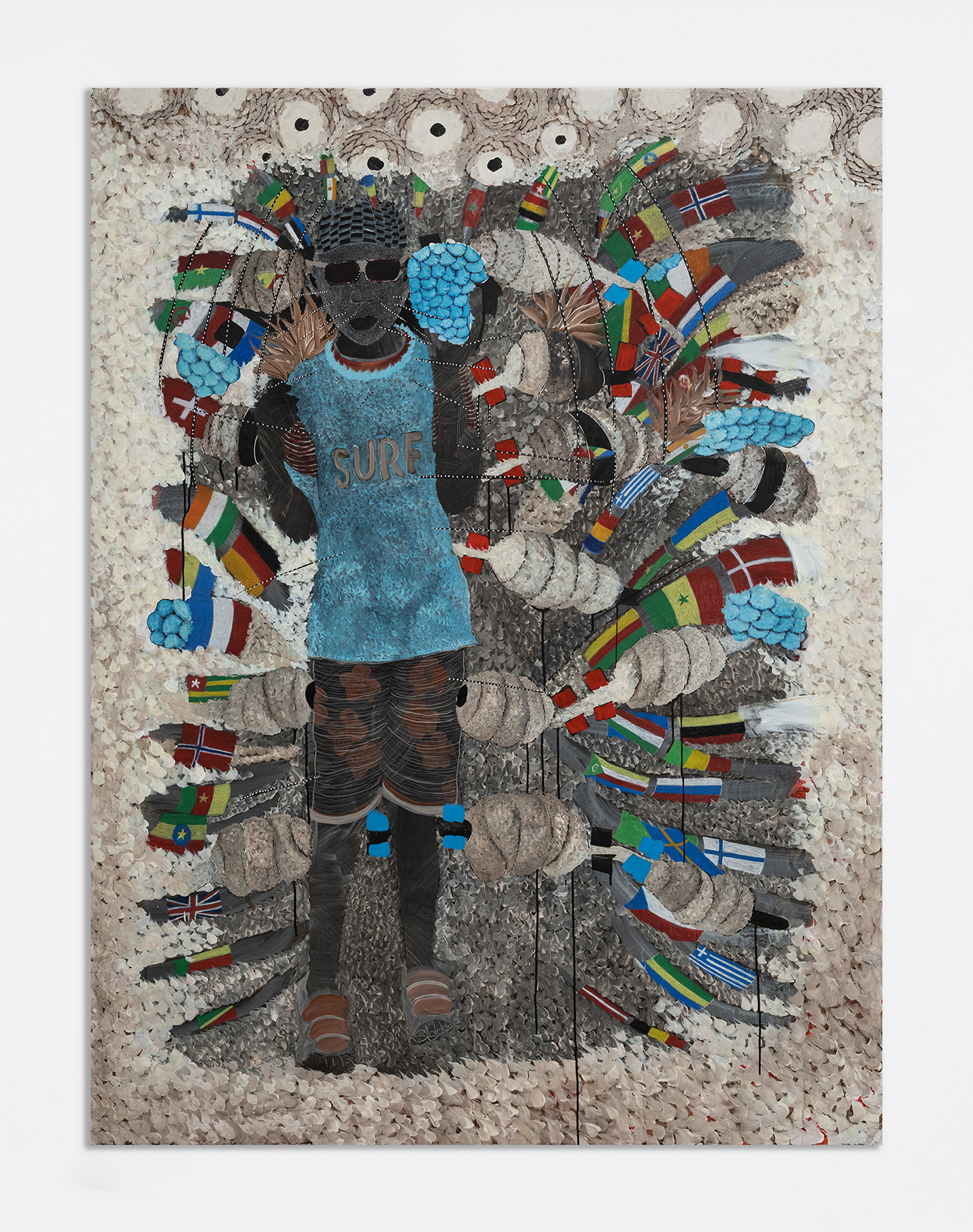 Born in 1977 in Senegal, Omar Ba lives and works in Dakar. His paintings, produced using a variety of techniques and materials, represent political and social motifs open to multiple interpretations. His artistic vocabulary raises historical and timeless questions while formulating a wholly contemporary artistic message.  Omar Ba’s iconography features personal metaphors, ancestral references and hybrid figures. This combination of heterogeneous elements illustrates his desire to abolish boundaries and categories. His work, with its enigmatic nature and poetic intensity, rejects all forms of didactic narrative, seeking instead to express his subconscious and his symbolic interpretation of the real.