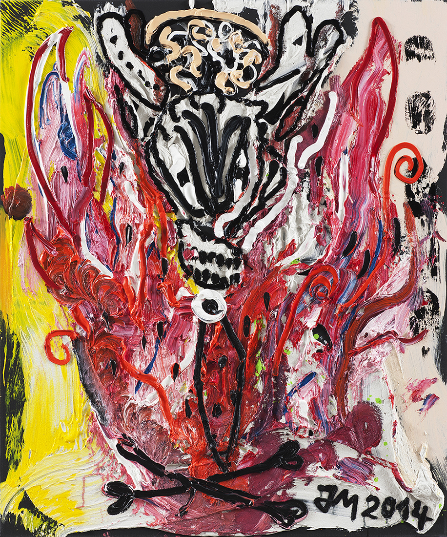 Born in 1970 in Tokyo, Jonathan Meese is a German artist who lives in Berlin. He has developed an uncategorizable body of work, lying somewhere between expressionism and actionism, combining painting, sculpture, installations and performance. His personal mythology is a blend of historical, legendary and science fiction references, evoking figures as varied as Fantômas, Maldoror and Stalin, all of whom represent different facets of the artist’s identity. His work espouses the ‘dictatorship of art’.