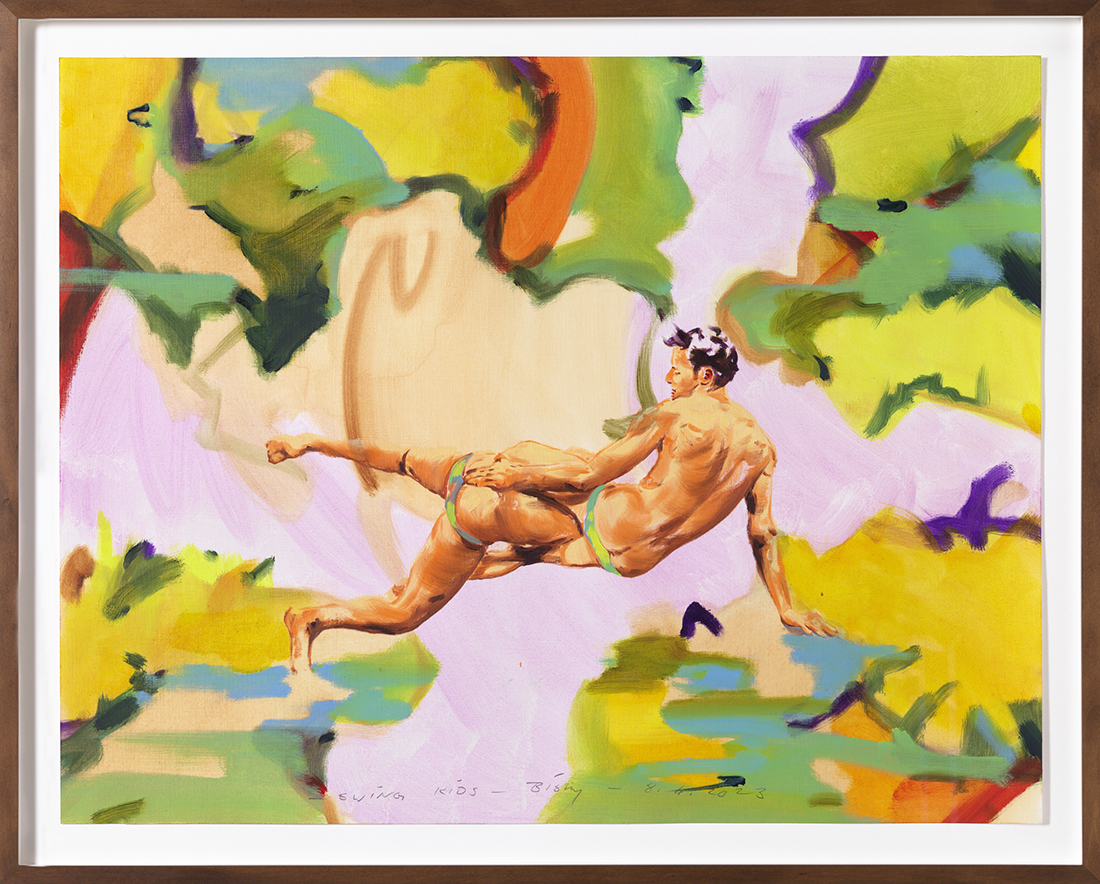 Norbert Bisky was born in 1970 in Leipzig, Germany. His treatment of landscapes and exploration of the portrait and narrative structure place him firmly in the tradition of great European painting. But Norbert Bisky's experiments with breaking down forms and with blocks of colour also place him on the borderline of abstract art. His figurative style of painting, conjuring up the socialist realism he experienced as a child in GDR, suggests both hedonism and chaos in its contemporary form.